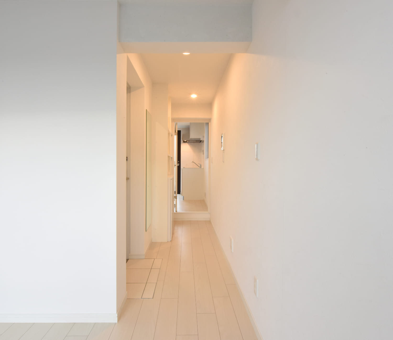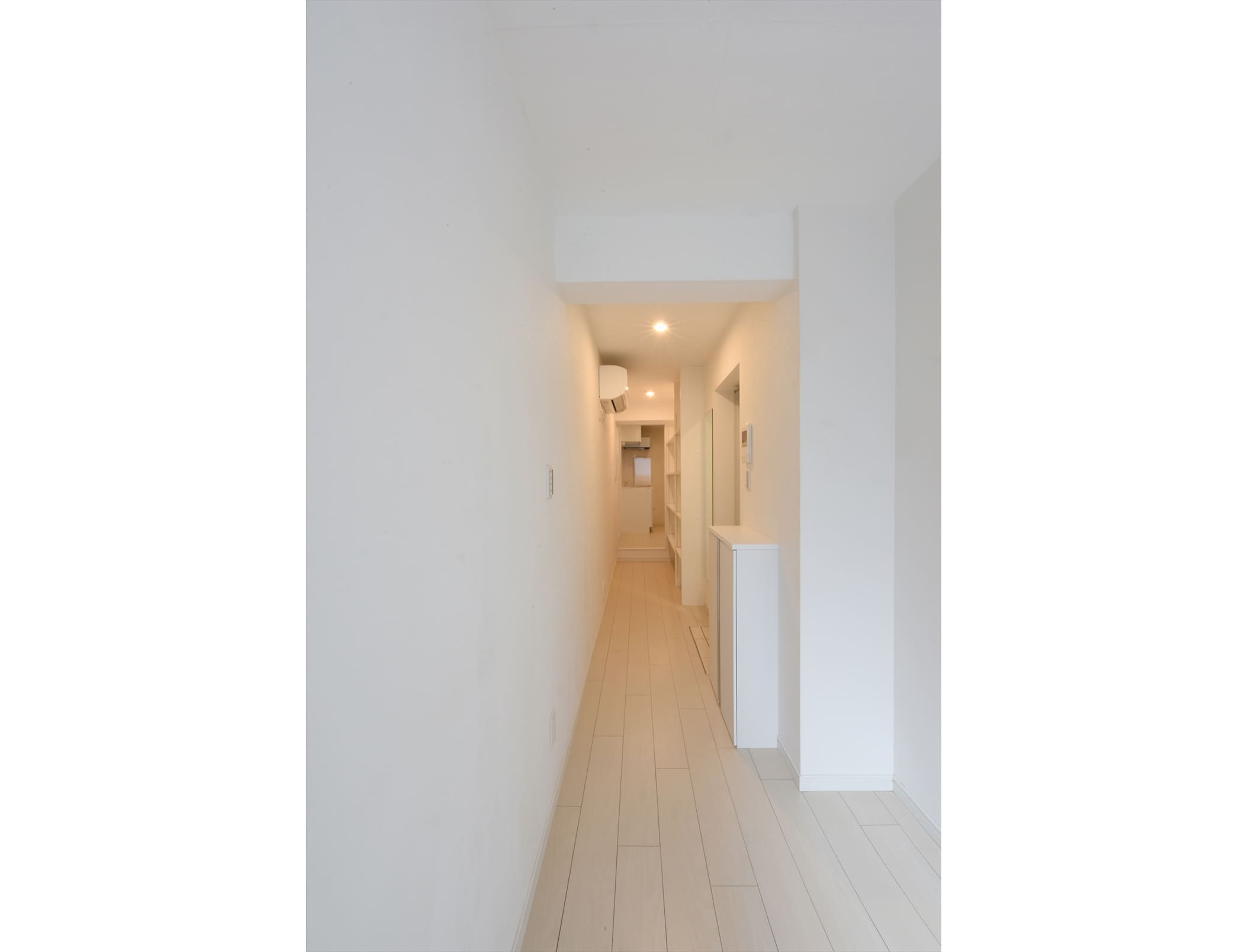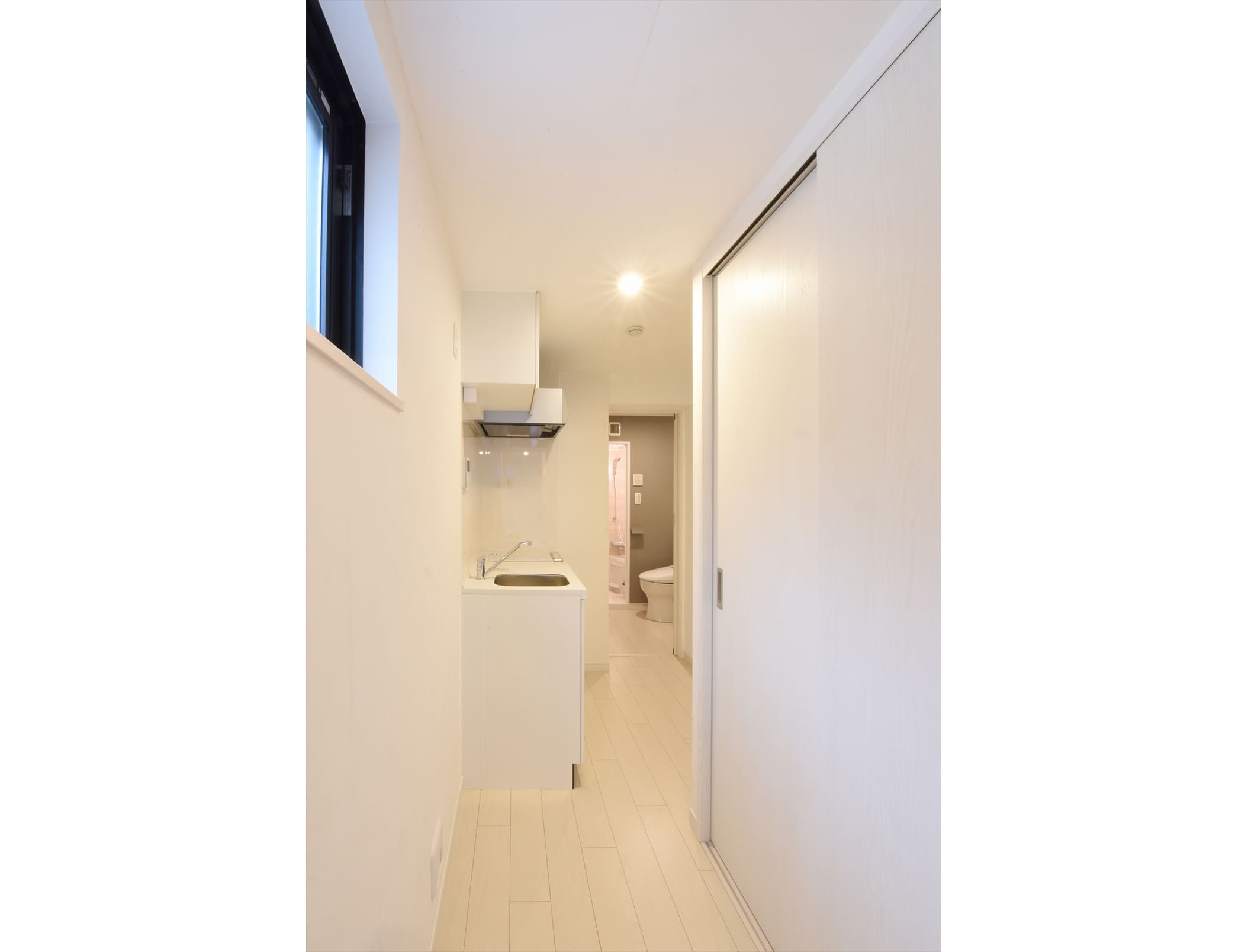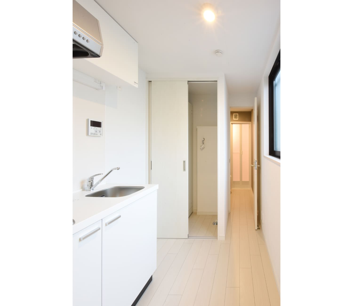 細長い平面計画ではあるのですが、キッチンが玄関の前にあるような、いわゆるオーソドックスな1Kタイプではなく居住スペース、キッチン、水回りと空間がきちんと分けられた住みやすい住戸が出来上がりました。
