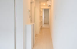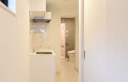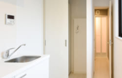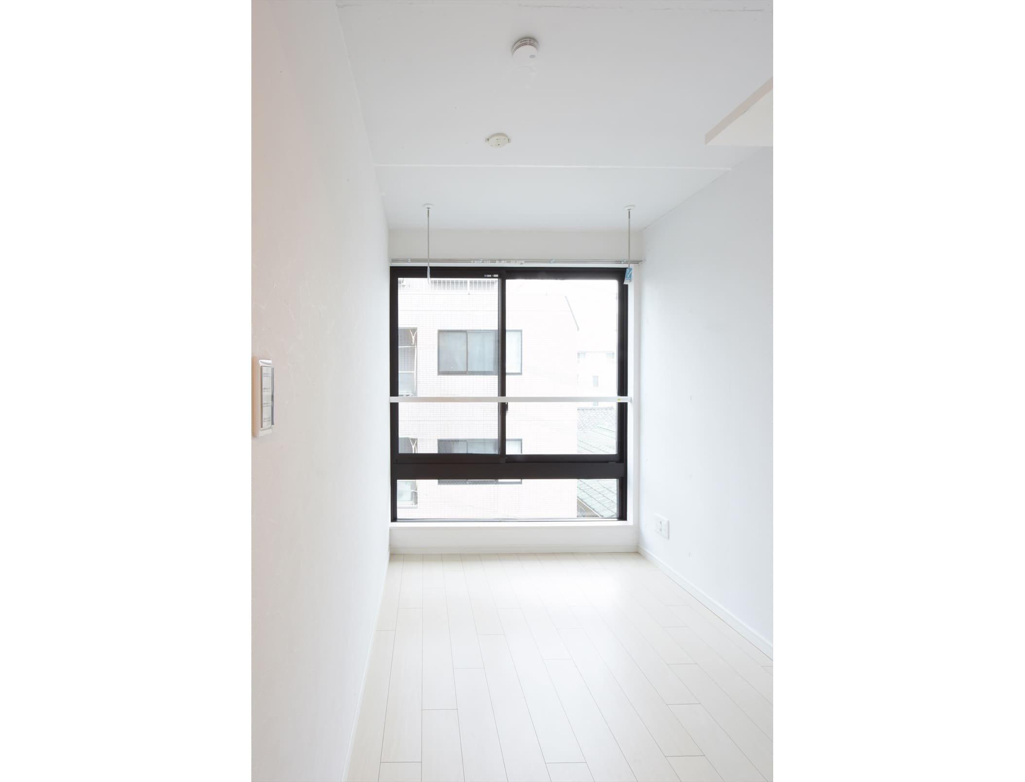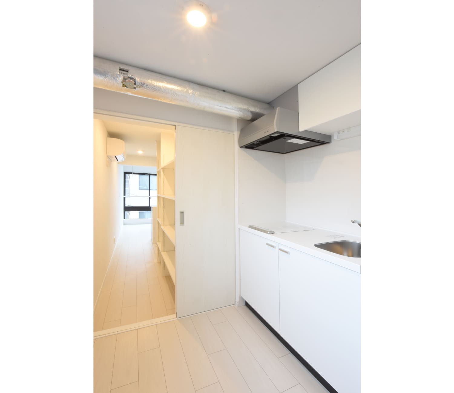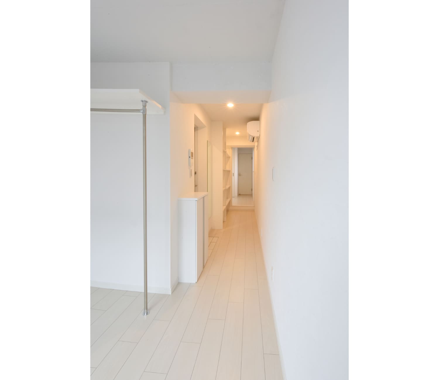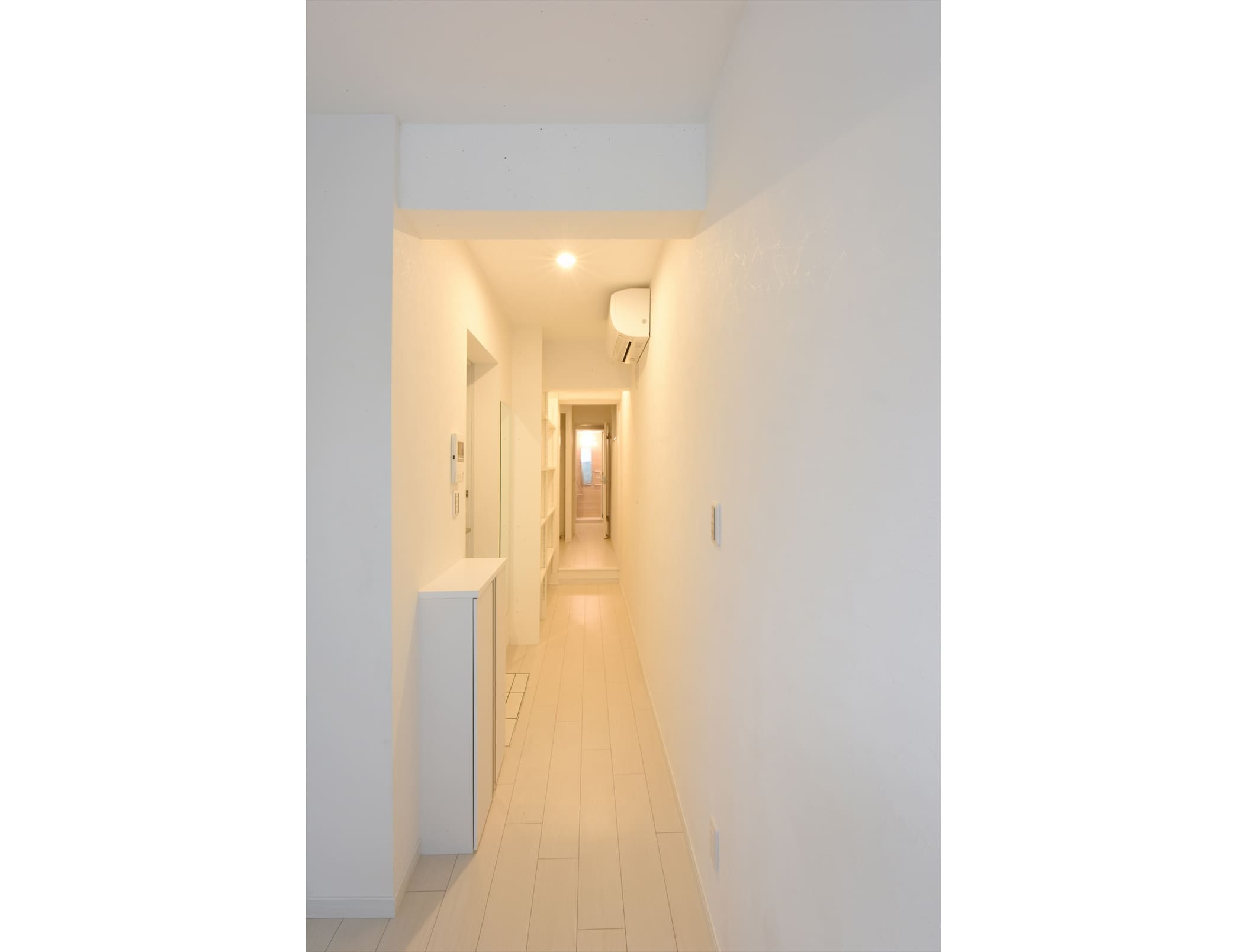 細長い平面計画ではあるのですが、キッチンが玄関の前にあるような、いわゆるオーソドックスな1Kタイプではなく居住スペース、キッチン、水回りと空間がきちんと分けられた住みやすい住戸が出来上がりました。