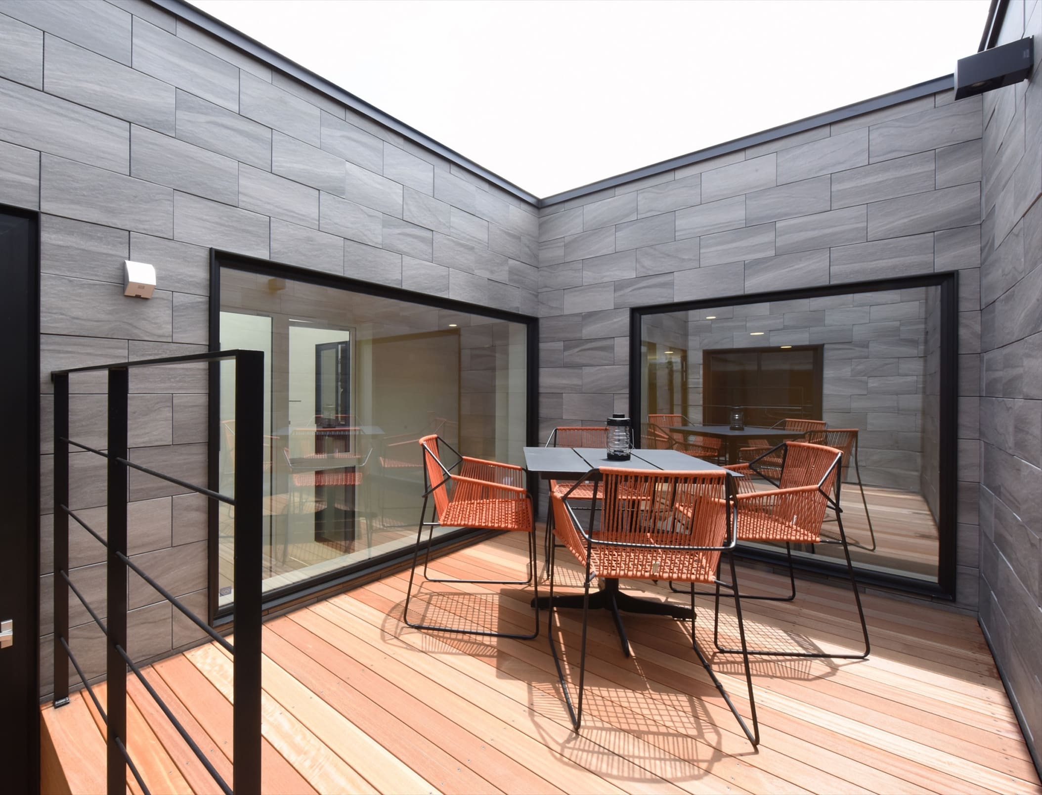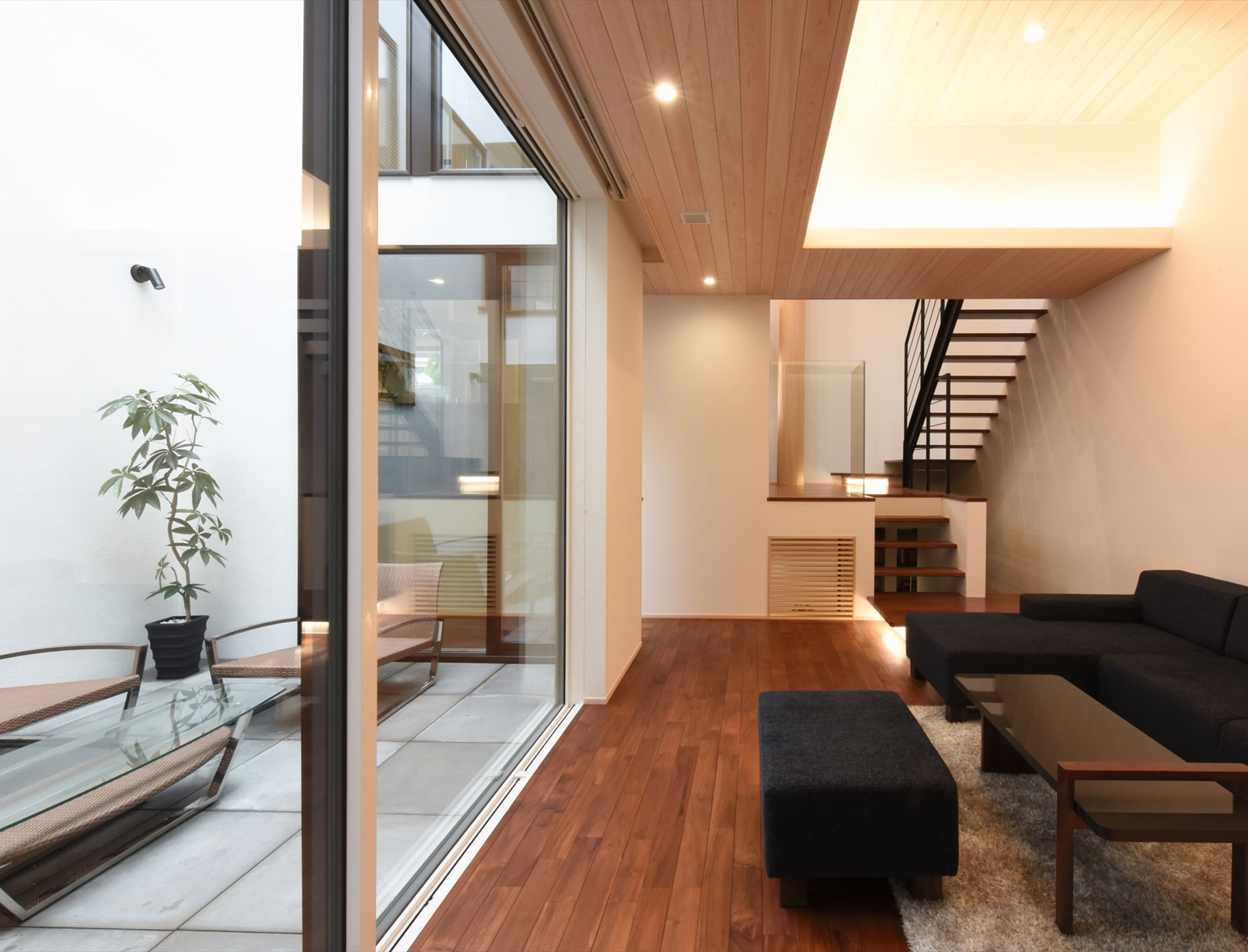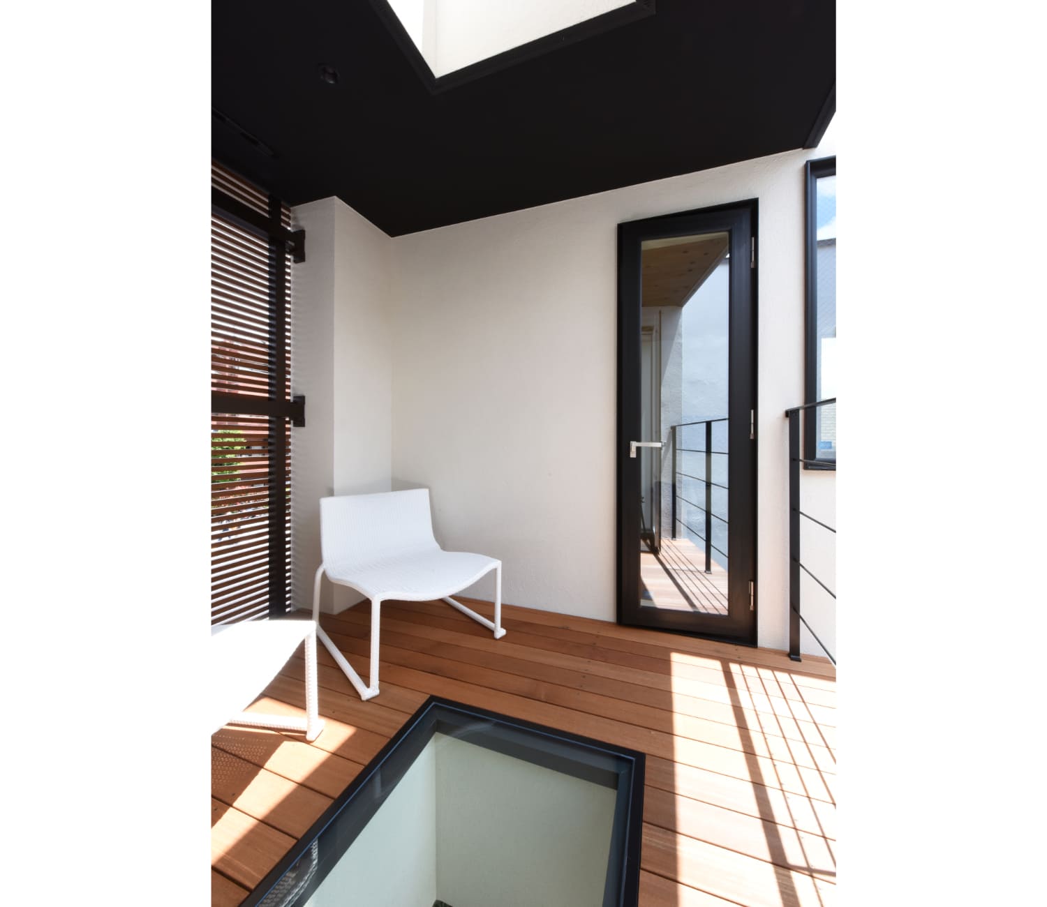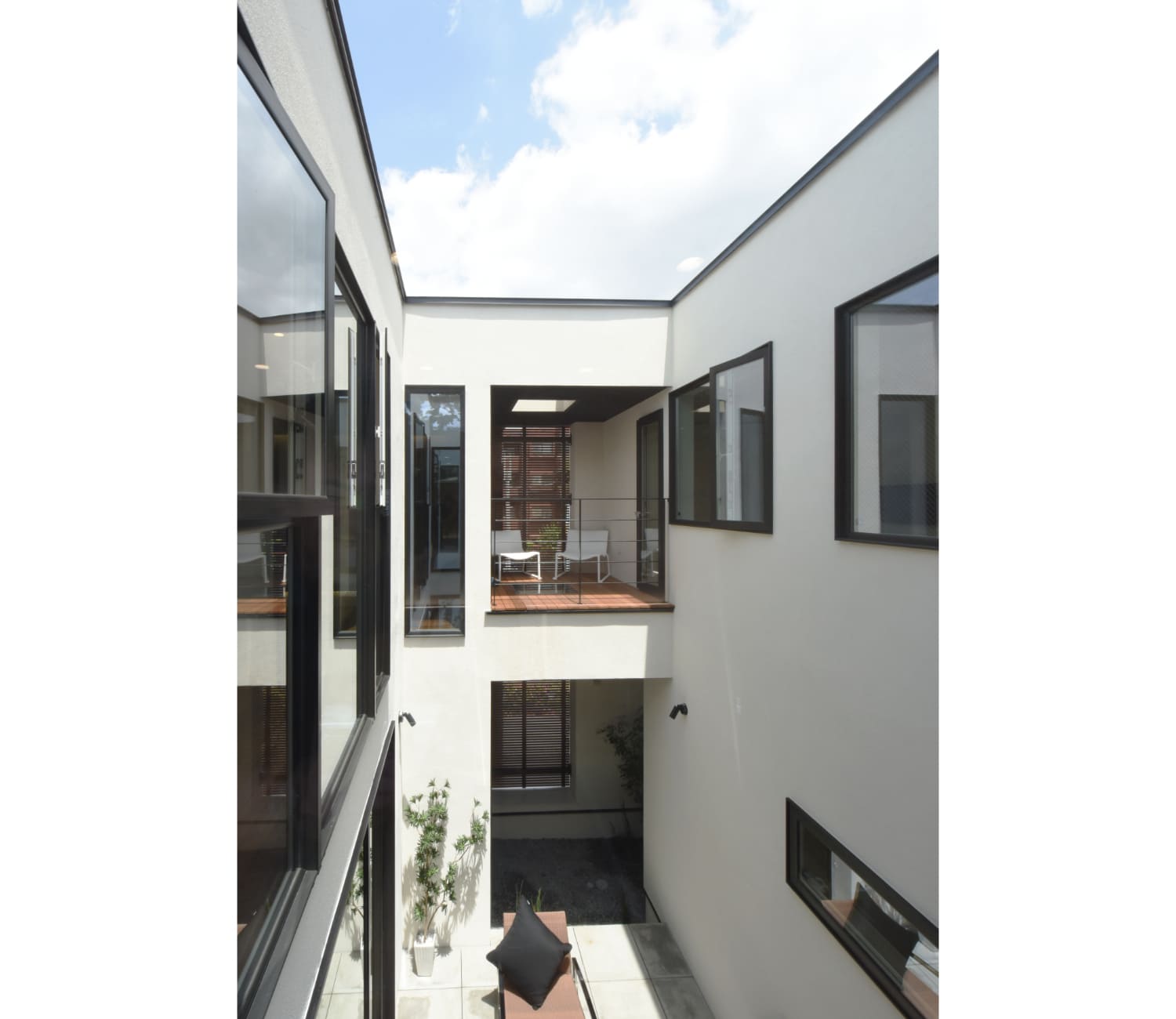 家の中のどの空間にも光を届ける中庭、プライバシーを保ちつつ空を近く感じるスカイデッキ、