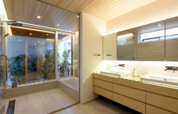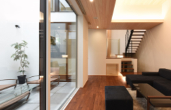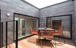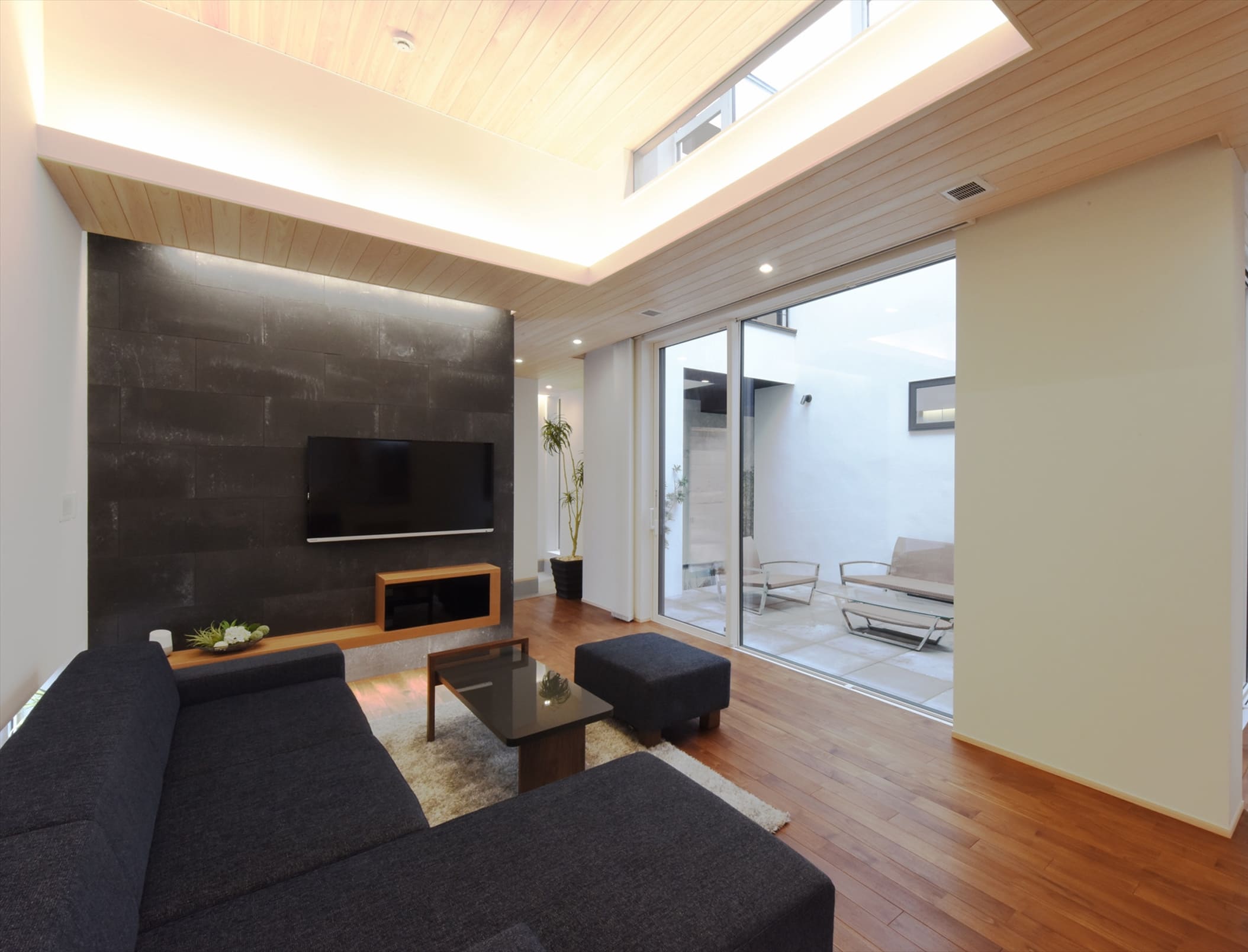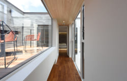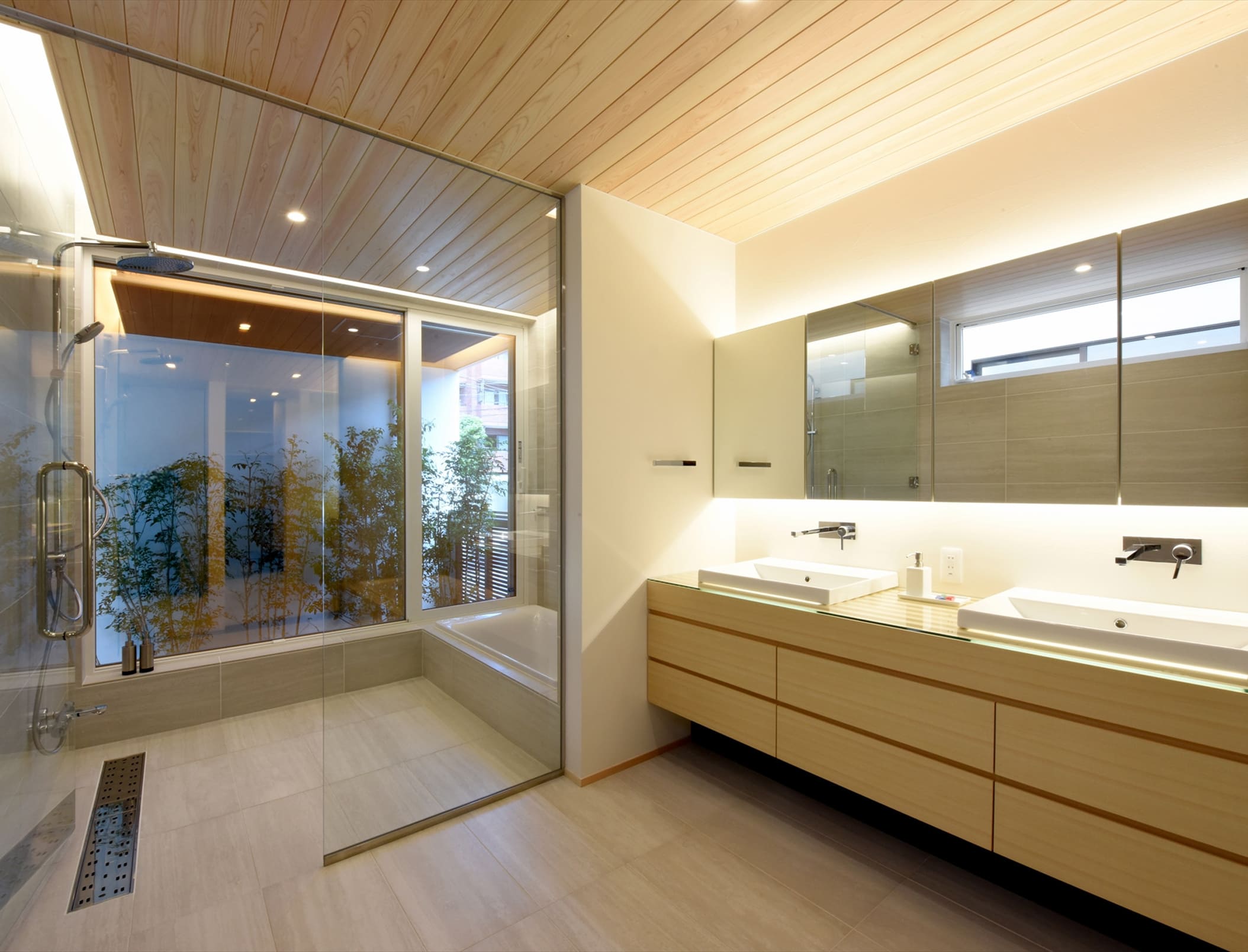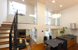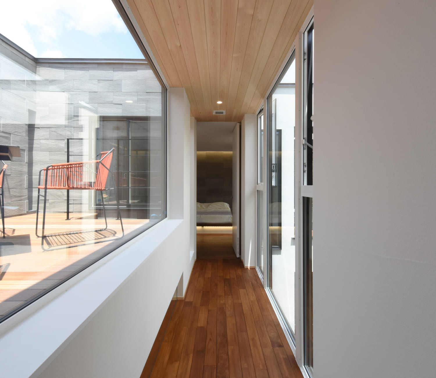 家の中のどの空間にも光を届ける中庭、プライバシーを保ちつつ空を近く感じるスカイデッキ、