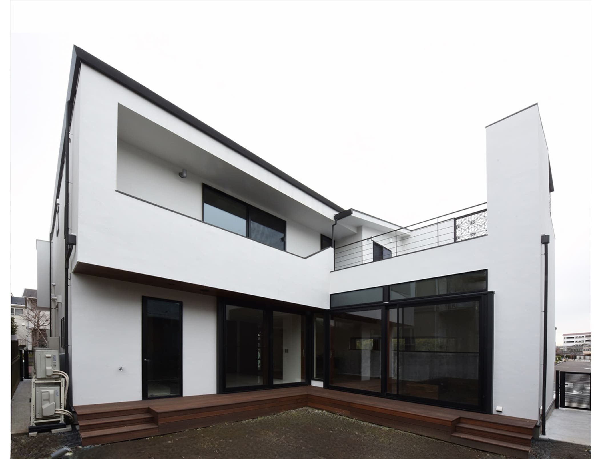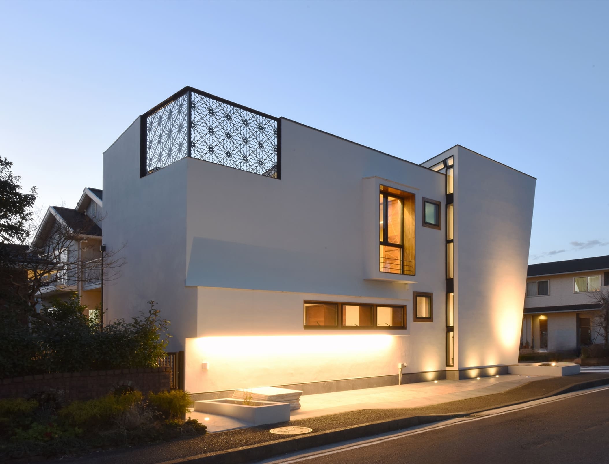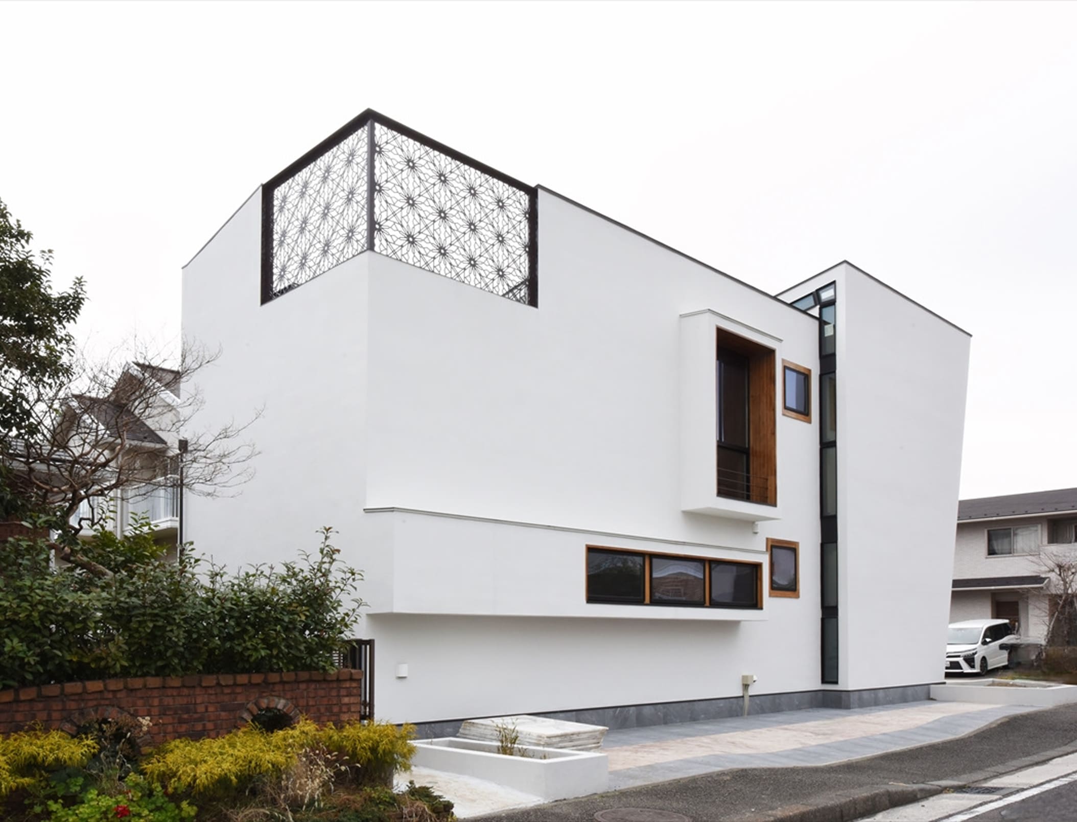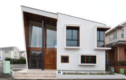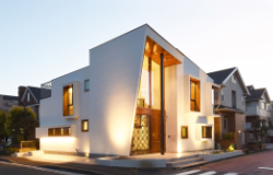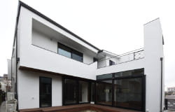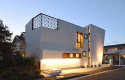 周辺の建物の調和、建物のダイナミズム、外と内との連続による空間の伸び、厳しい条例による制限など色々な挑戦と試行錯誤を繰り返してできた住宅です。
