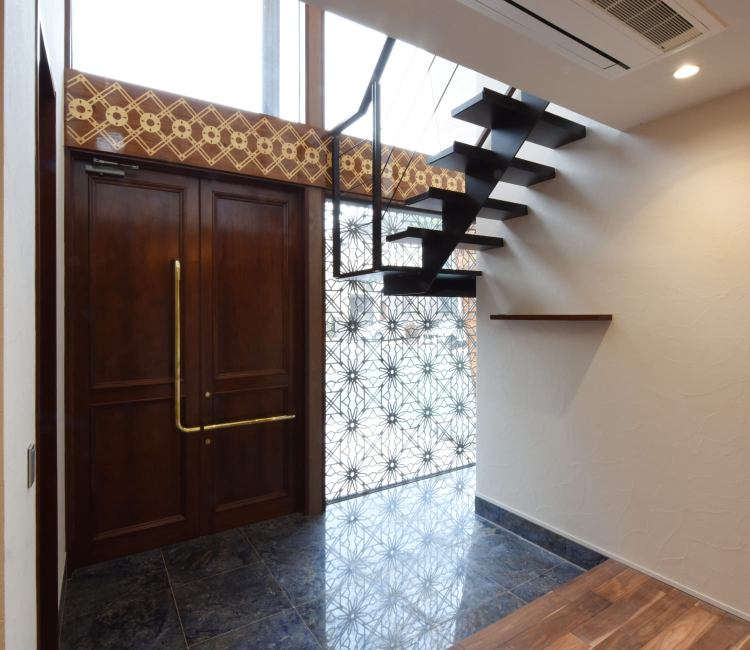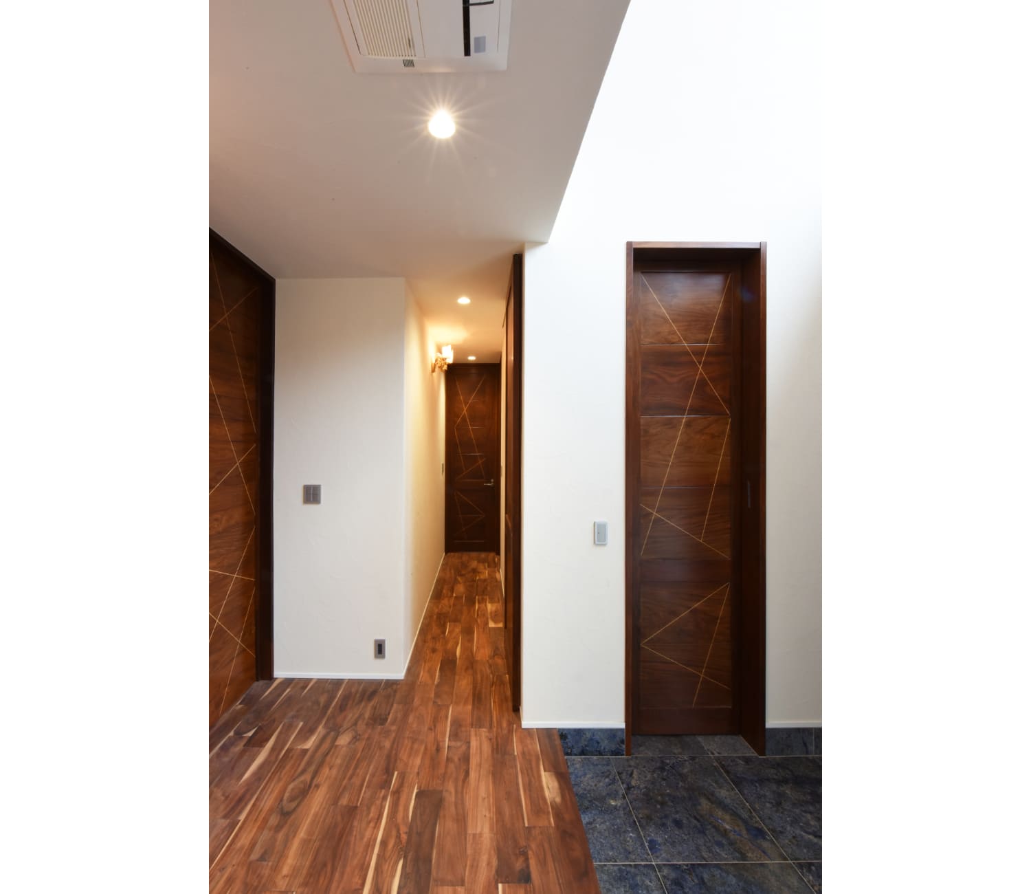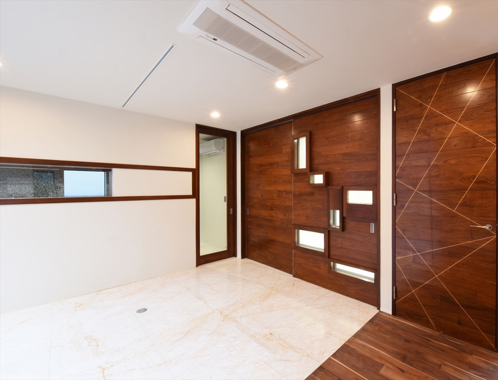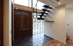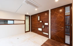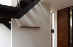 エントランスは広くて天井高を一般的な住宅より高く取り、スリット窓から入ってくる光は壁と天井を柔らかく照らしていて、一番大きなボリュームであるエントランス部分を軽快に見せています。