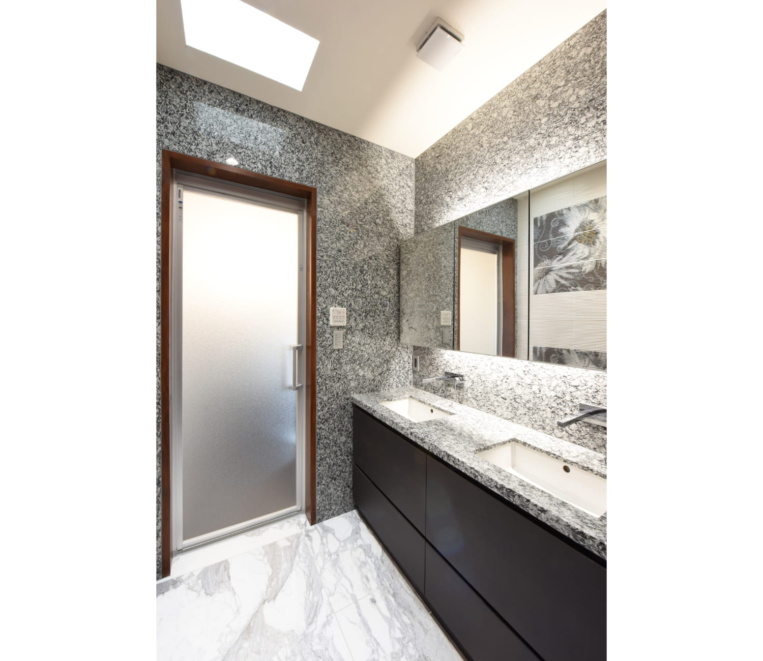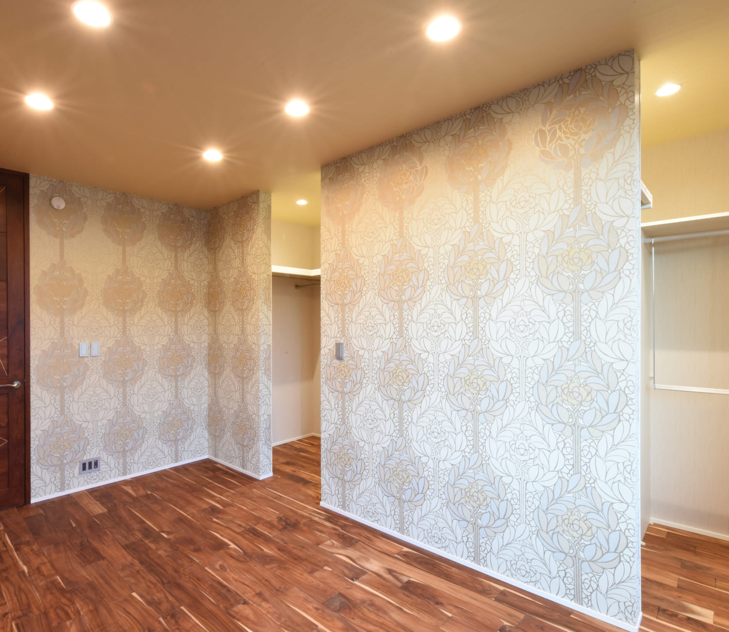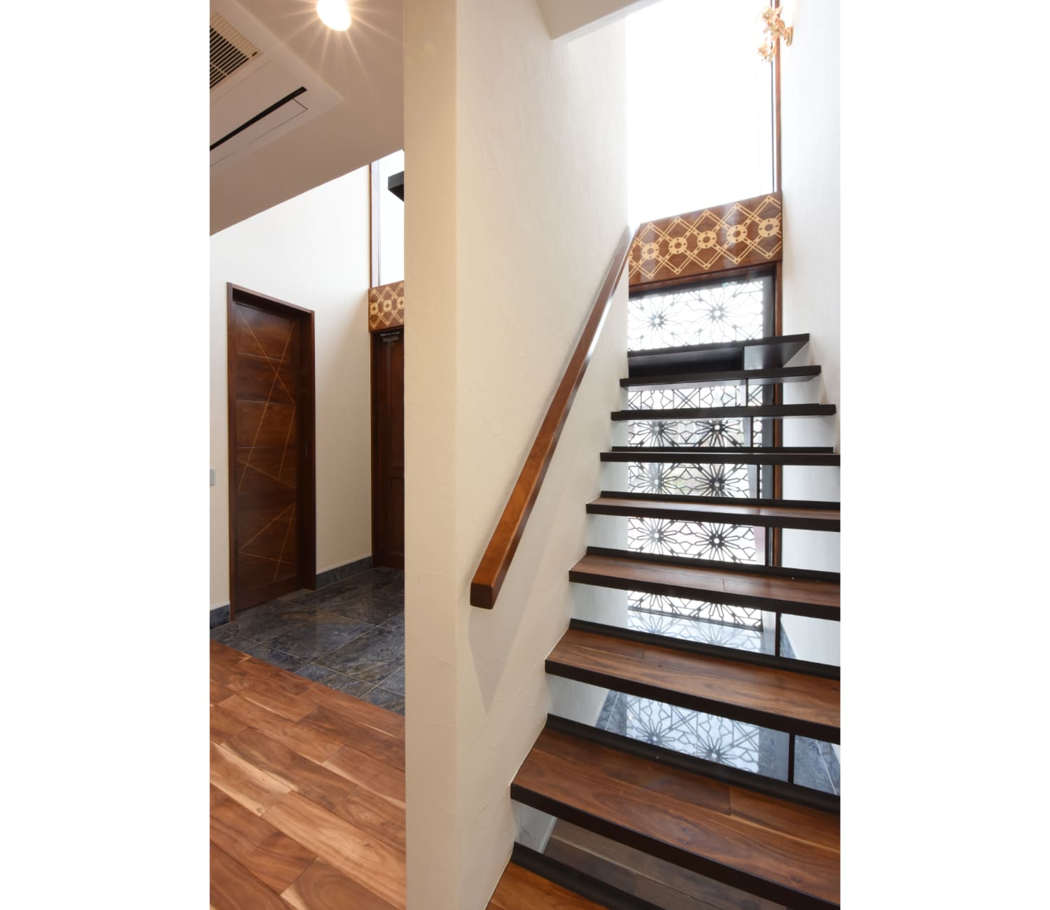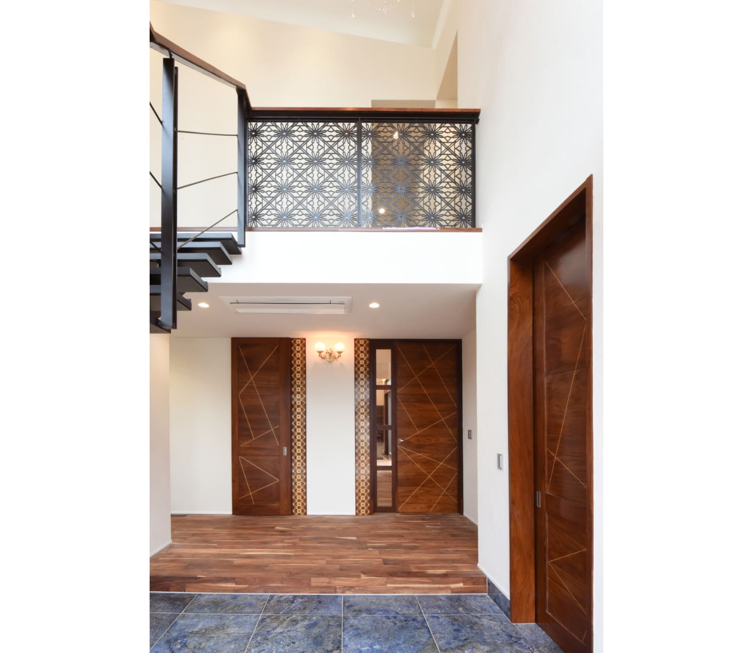 エントランスは広くて天井高を一般的な住宅より高く取り、スリット窓から入ってくる光は壁と天井を柔らかく照らしていて、一番大きなボリュームであるエントランス部分を軽快に見せています。