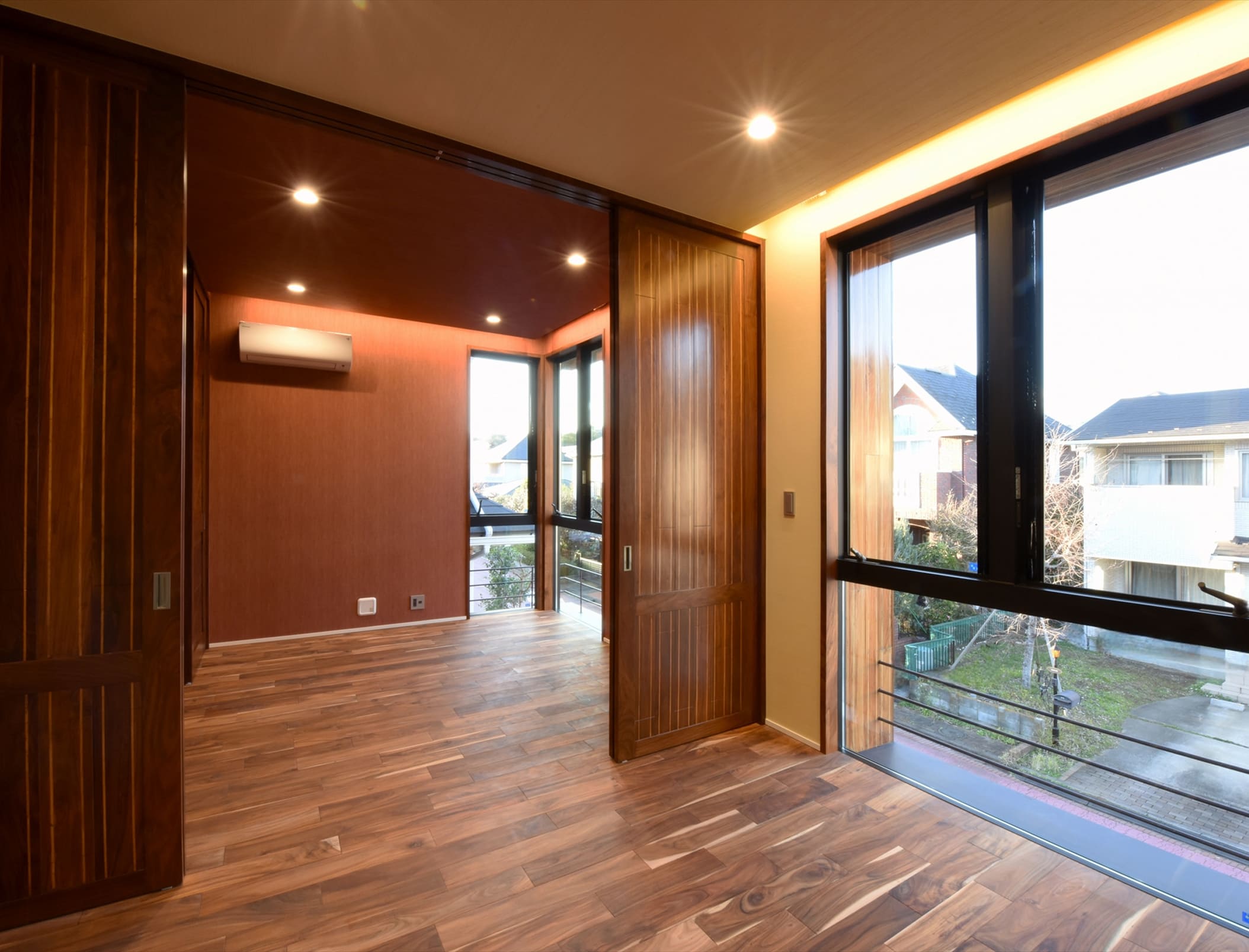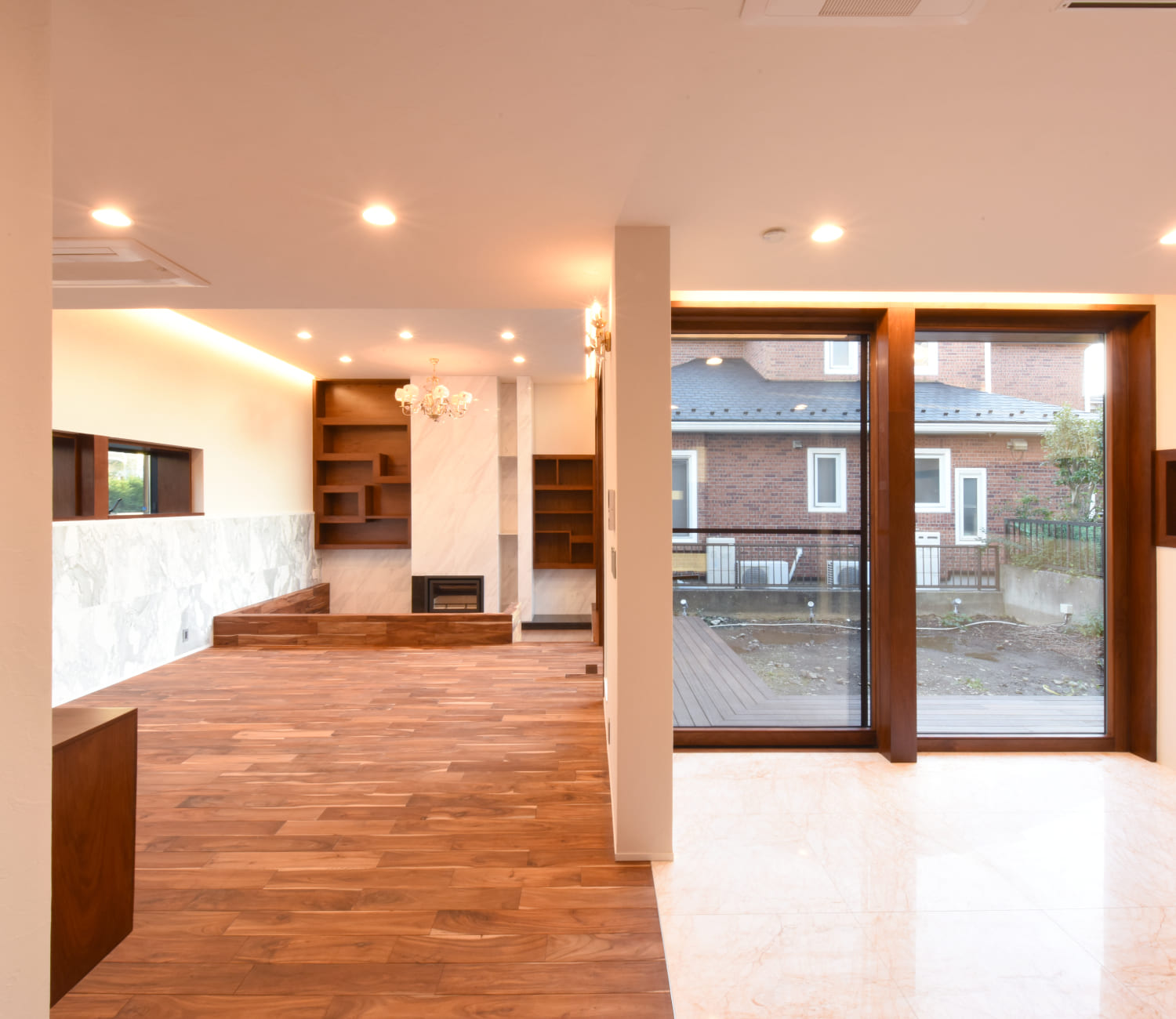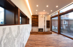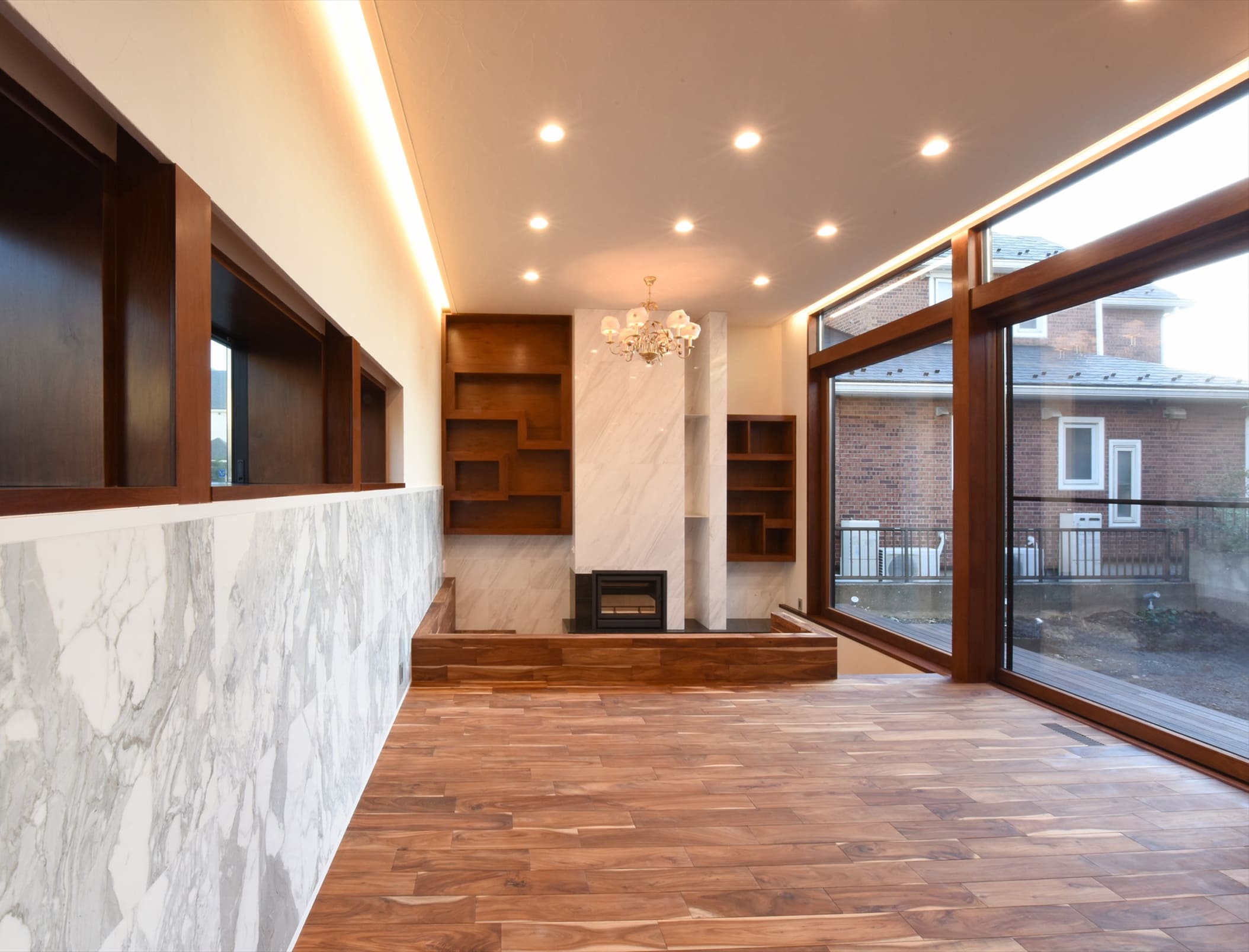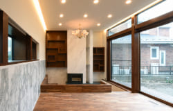 リビングには掘り下げた暖炉スペースがあり、暖炉を囲むようにソファが配置されていて家族やゲストとの団欒を演出するようになっています。