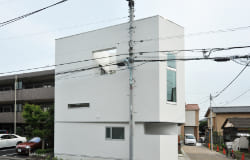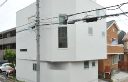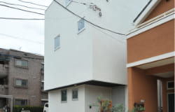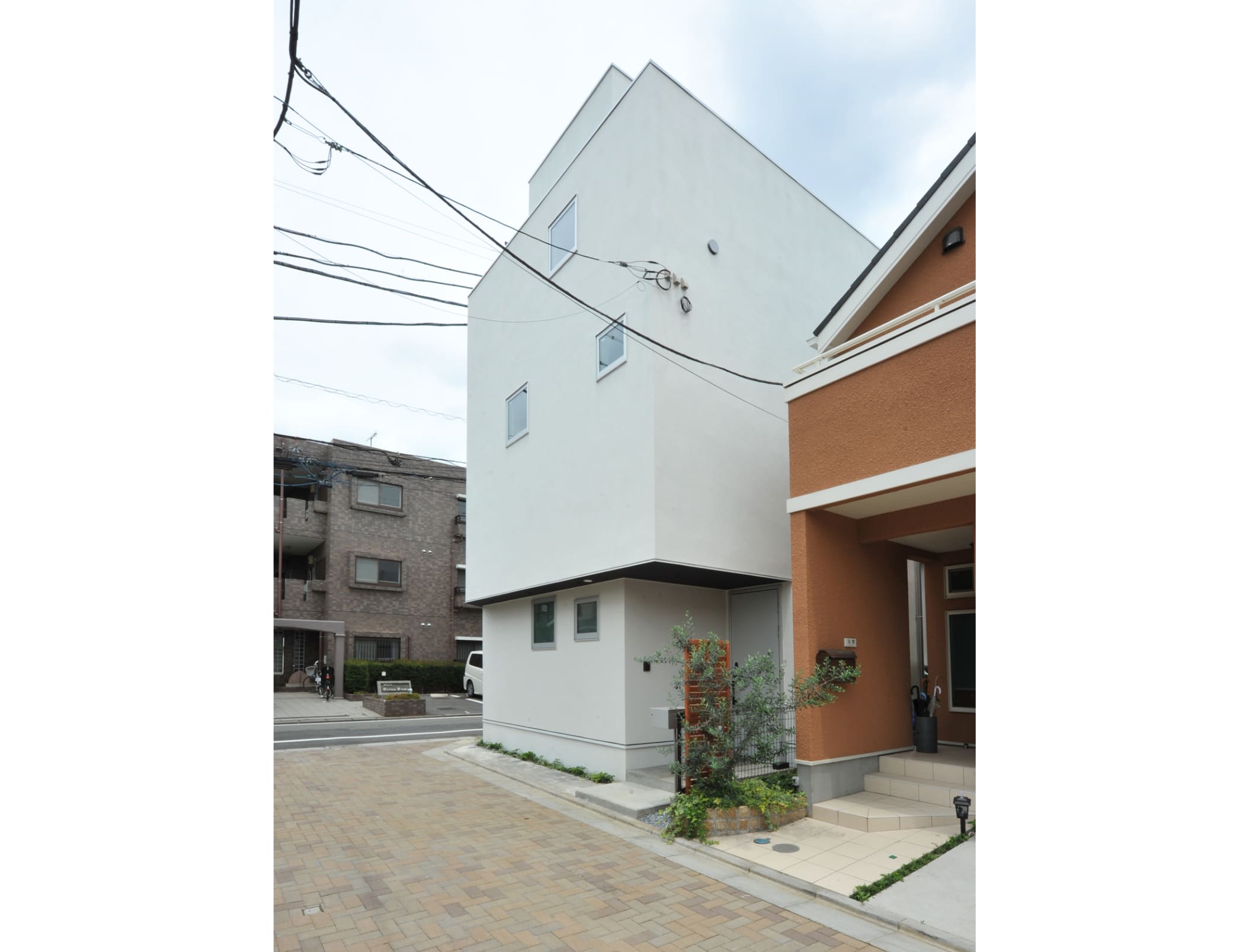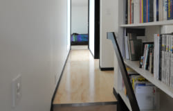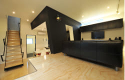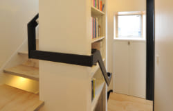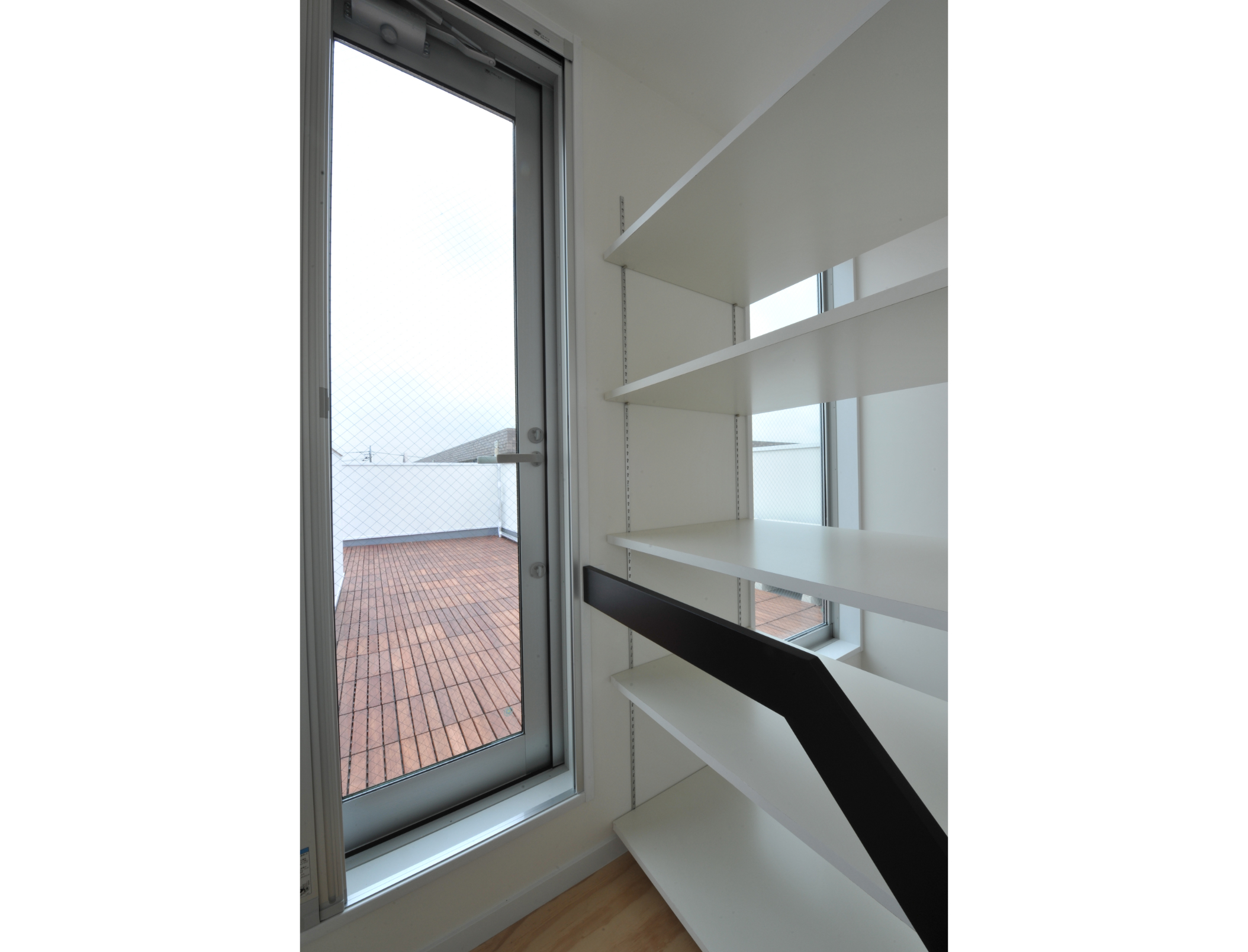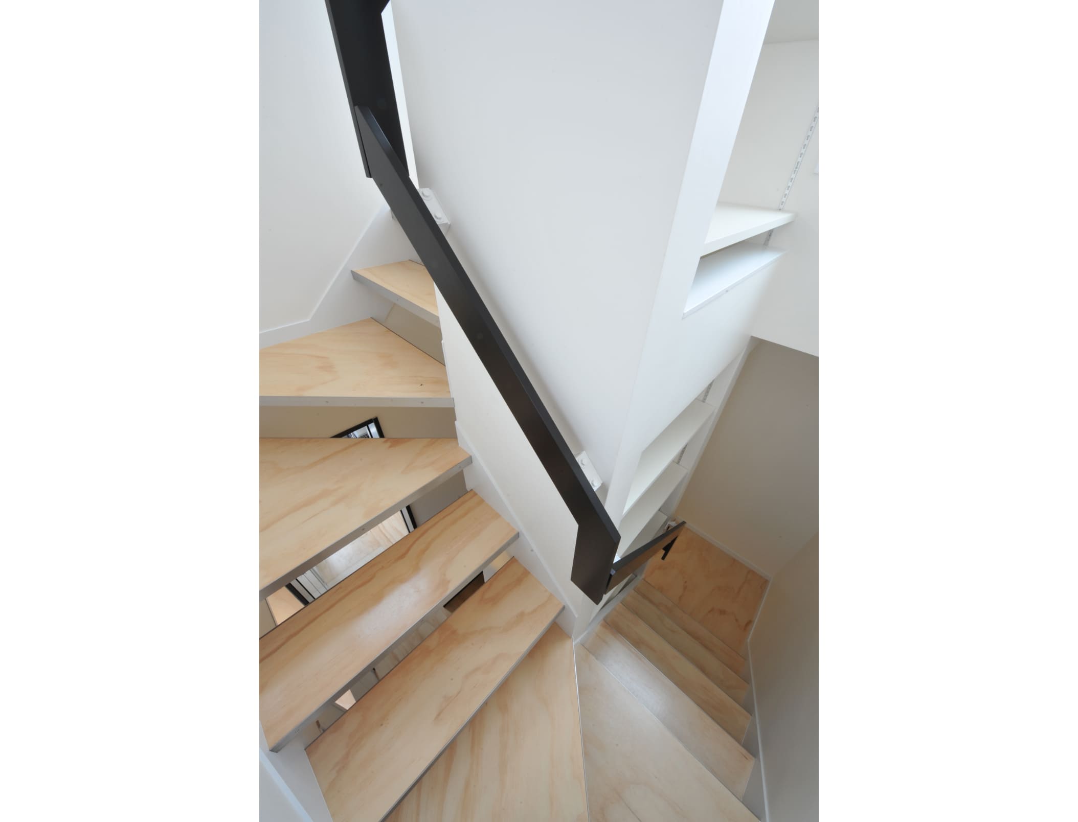 居住スペースを最大限確保しようとすると、収納スペースが少なくなり、収納を確保しようとすると居住スペースが狭くなるという矛盾から、居住スペースをスキップフロアーとし、各フロアーレベルの間に収納を差し込むという方法で収納スペースの確保を実現しました。