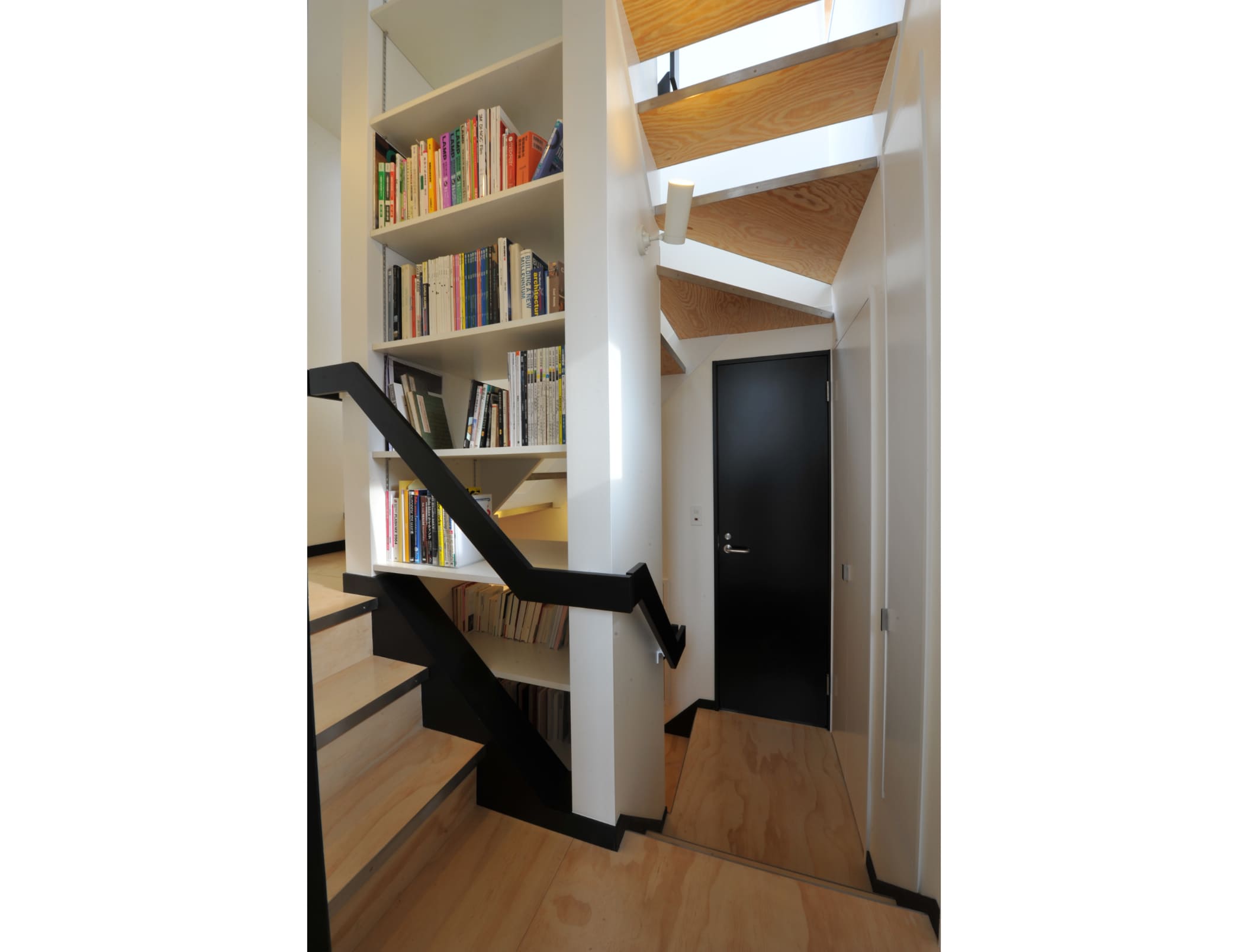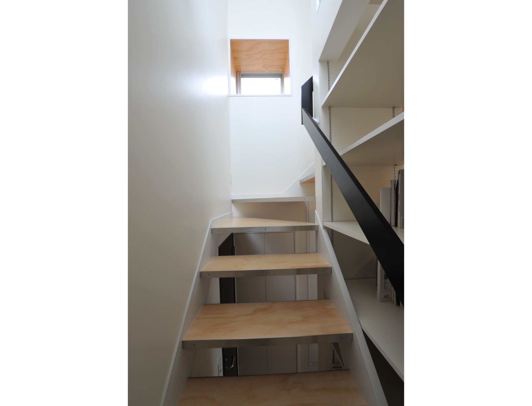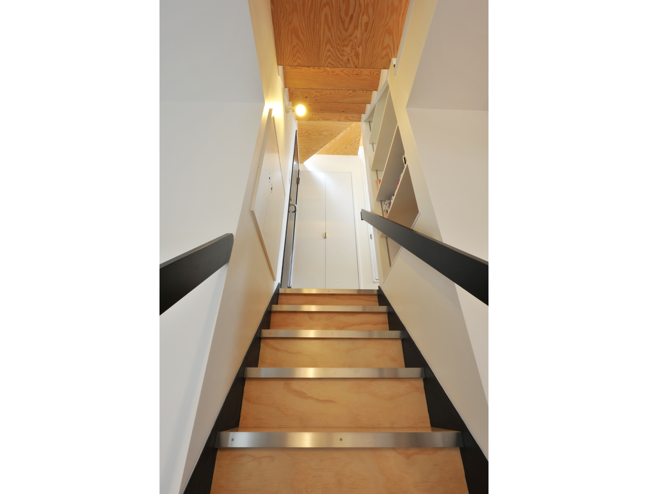 階段室の竪穴は、空気の流れるいわば、煙突として計画されています。階段室には開口部を数か所設け、夏季には熱せられた空気がペントハウスまで上昇しながら各開口部から換気されることにより自然な換気システムを生み出しています。空気の流れと光の透過を考え、蹴込板のないオープン階段としています。