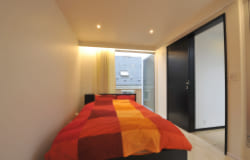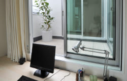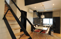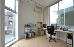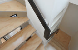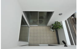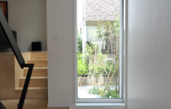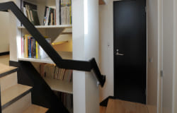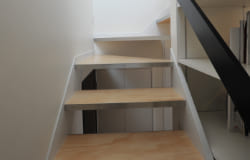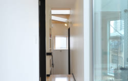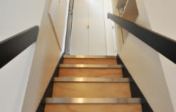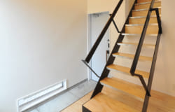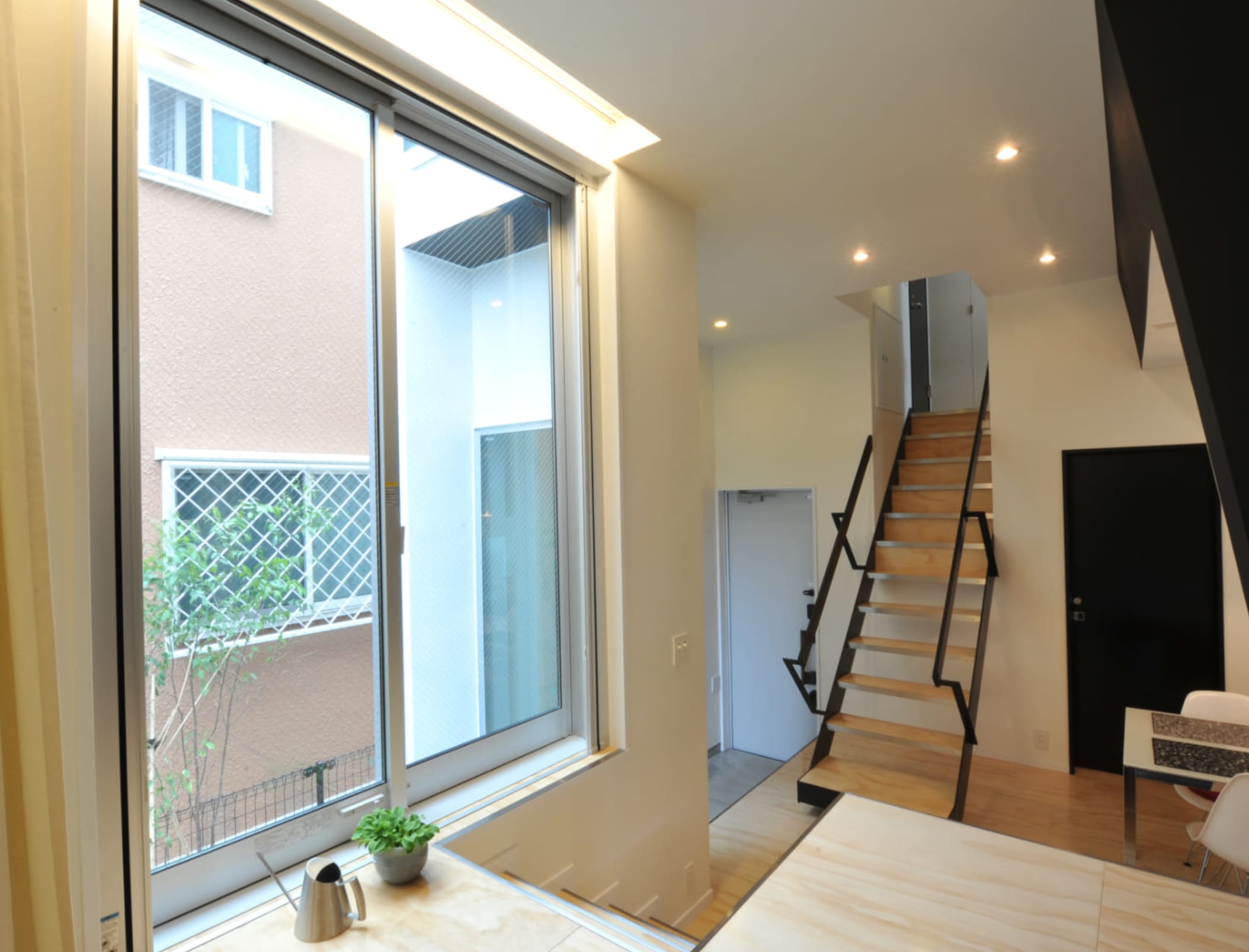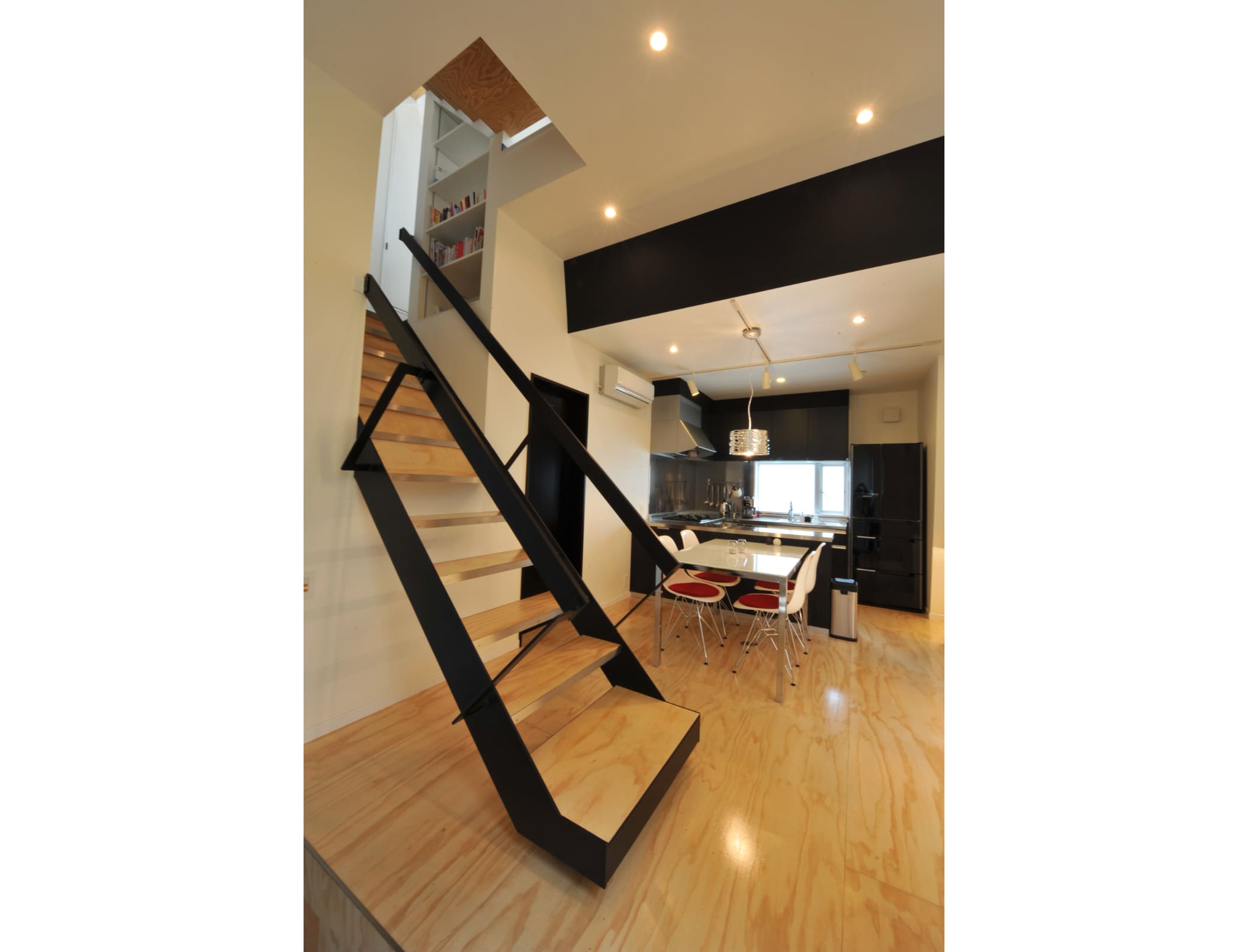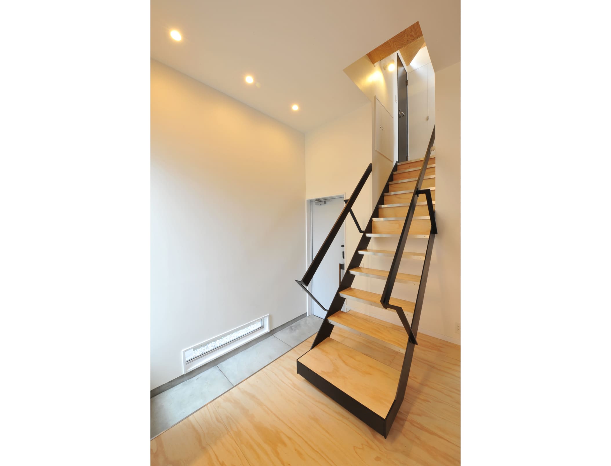階段室の竪穴は、空気の流れるいわば、煙突として計画されています。階段室には開口部を数か所設け、夏季には熱せられた空気がペントハウスまで上昇しながら各開口部から換気されることにより自然な換気システムを生み出しています。空気の流れと光の透過を考え、蹴込板のないオープン階段としています。
