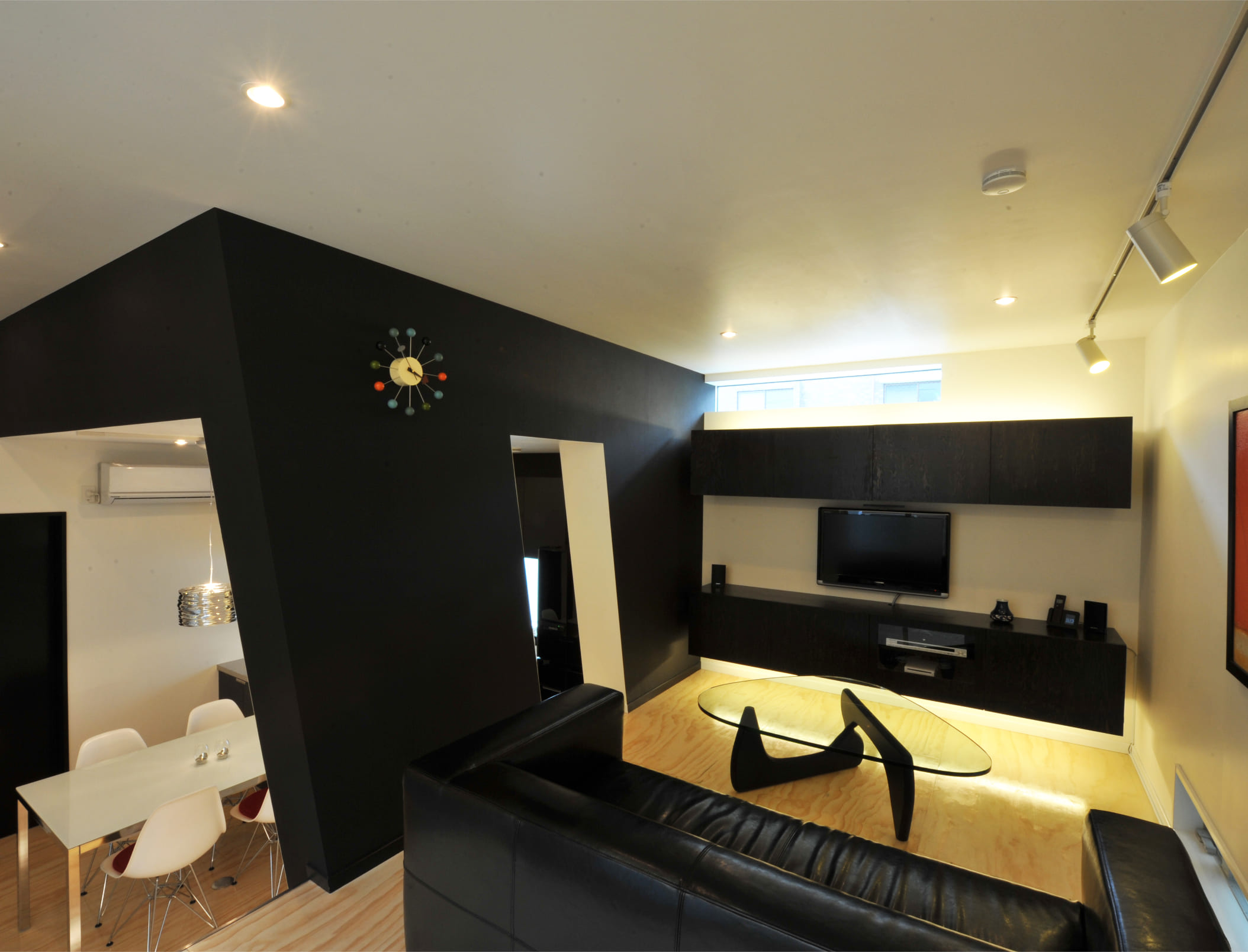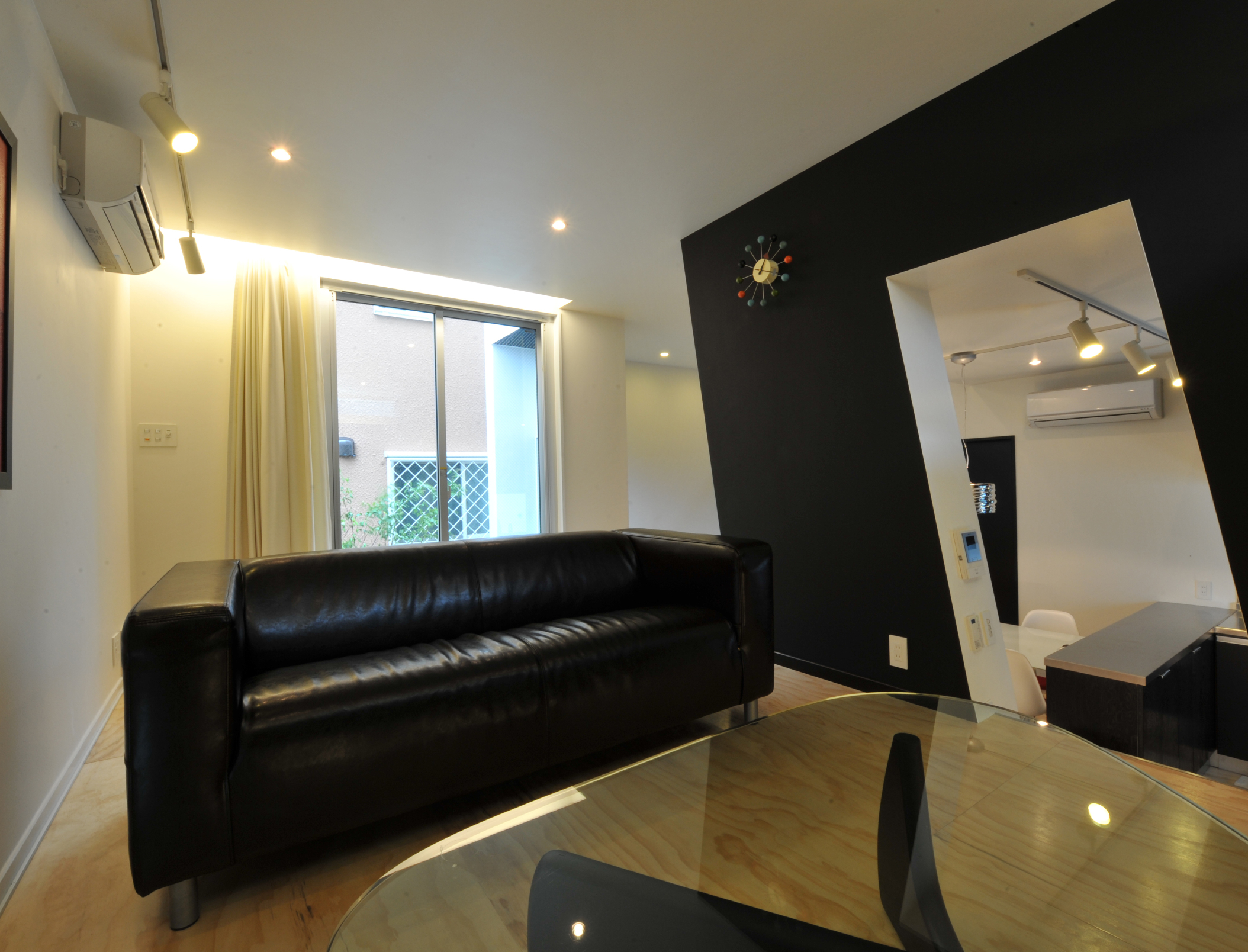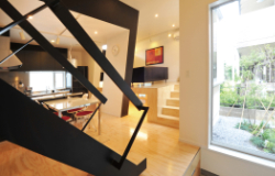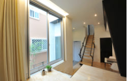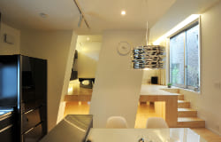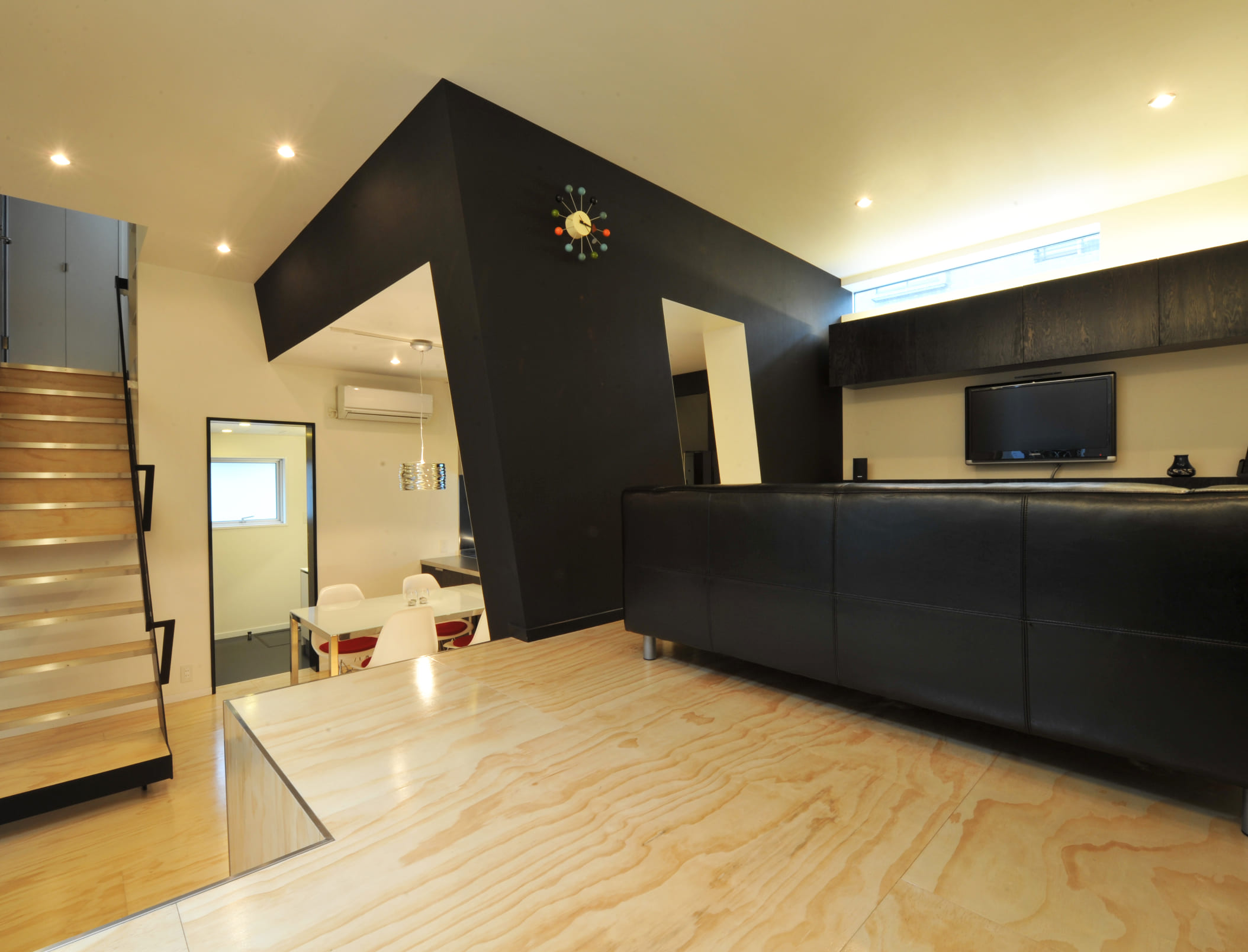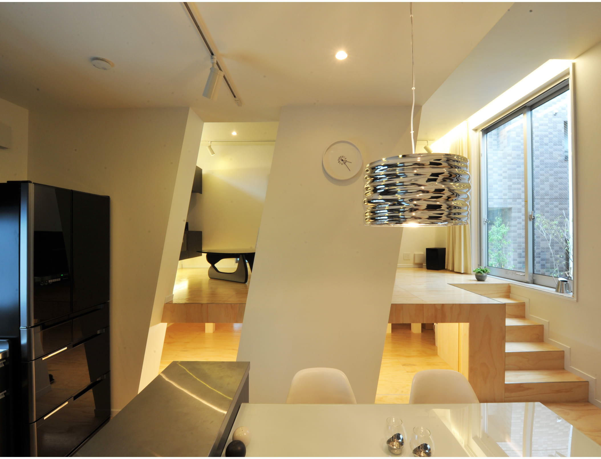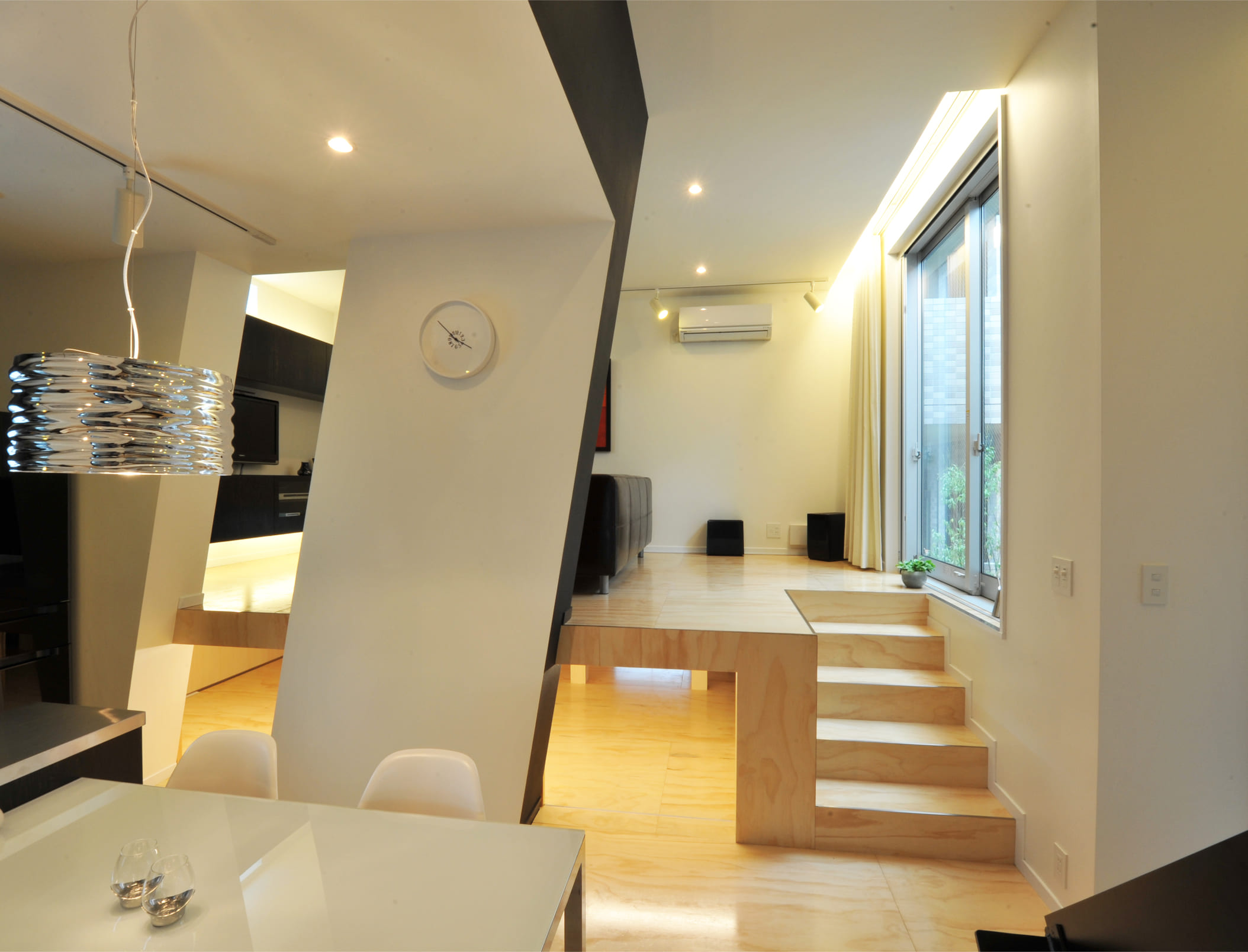 限られたスペースを有効的に空間利用をしようと床のレベル差を生み出したことで空間にリズムが生まれ、人と人の間を大切にしながらもお互いを認識できる、居る人を楽しくさせる魅力的で合理的なな住宅を実現することができました。