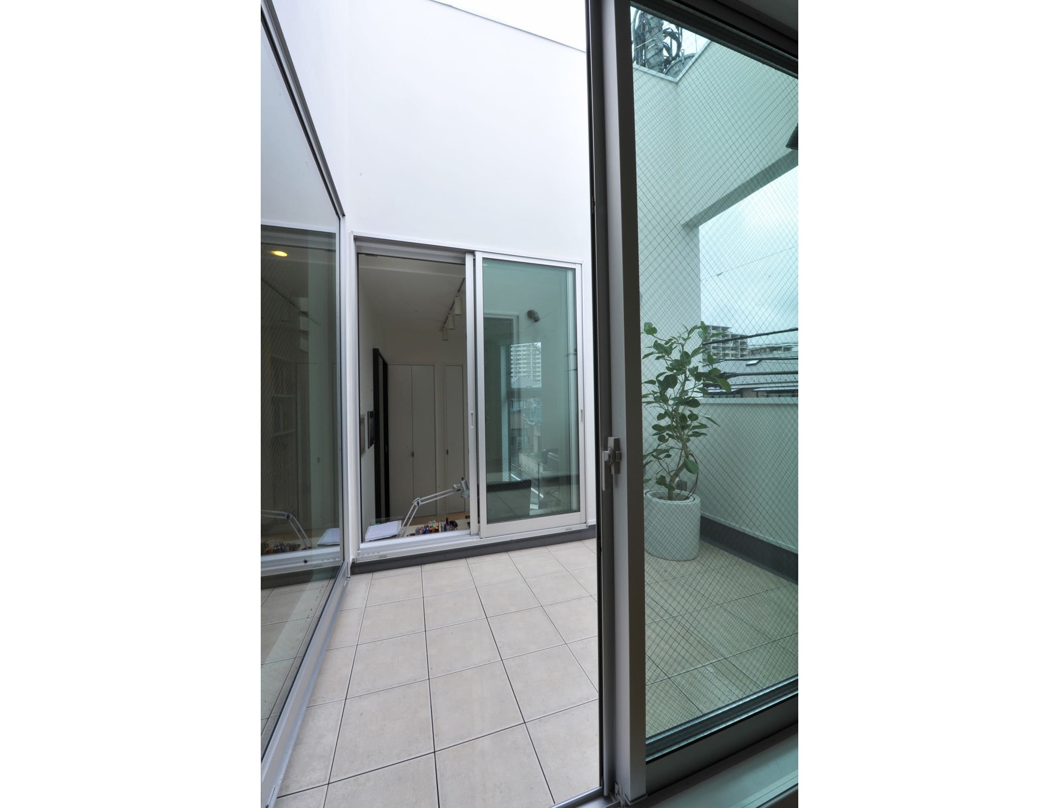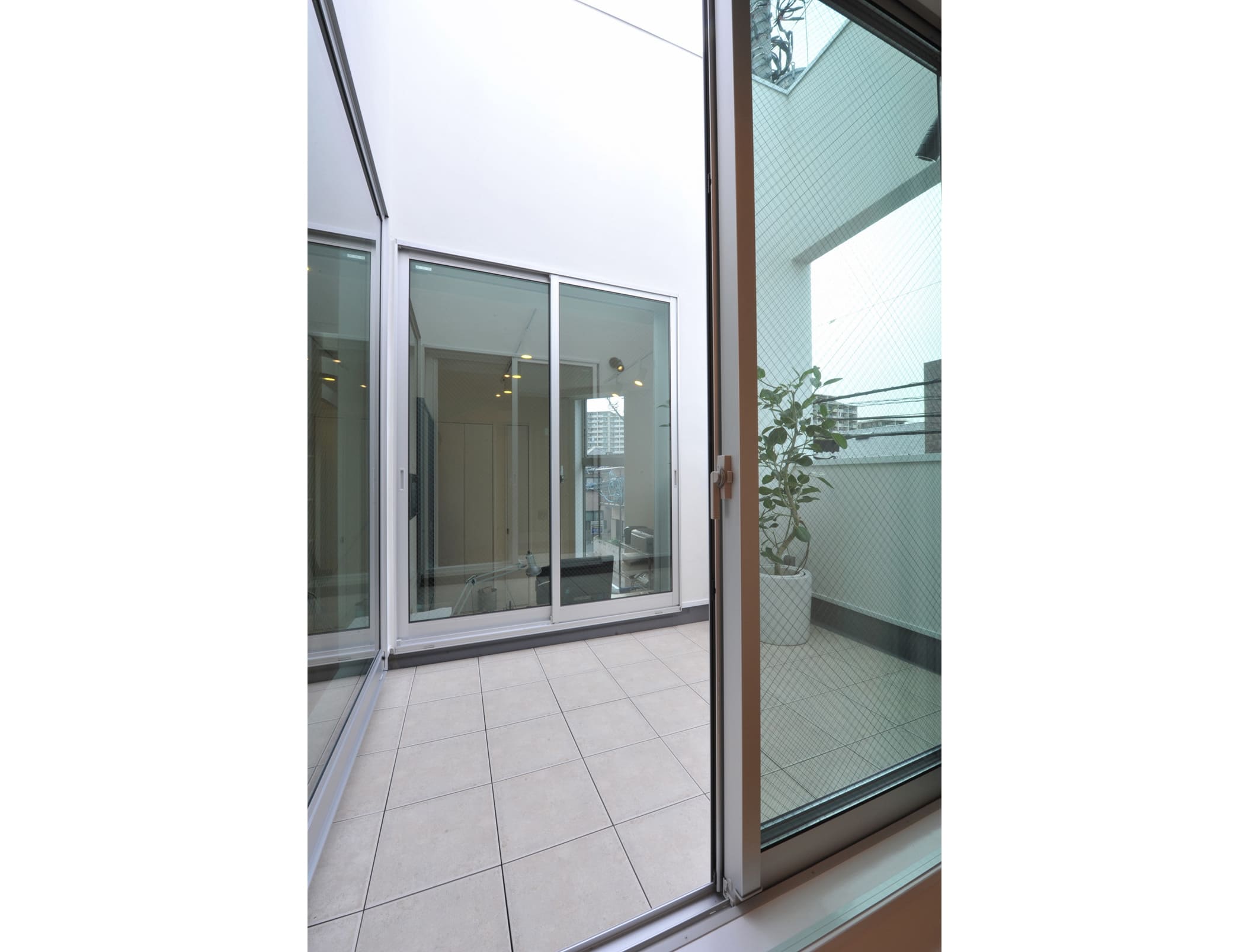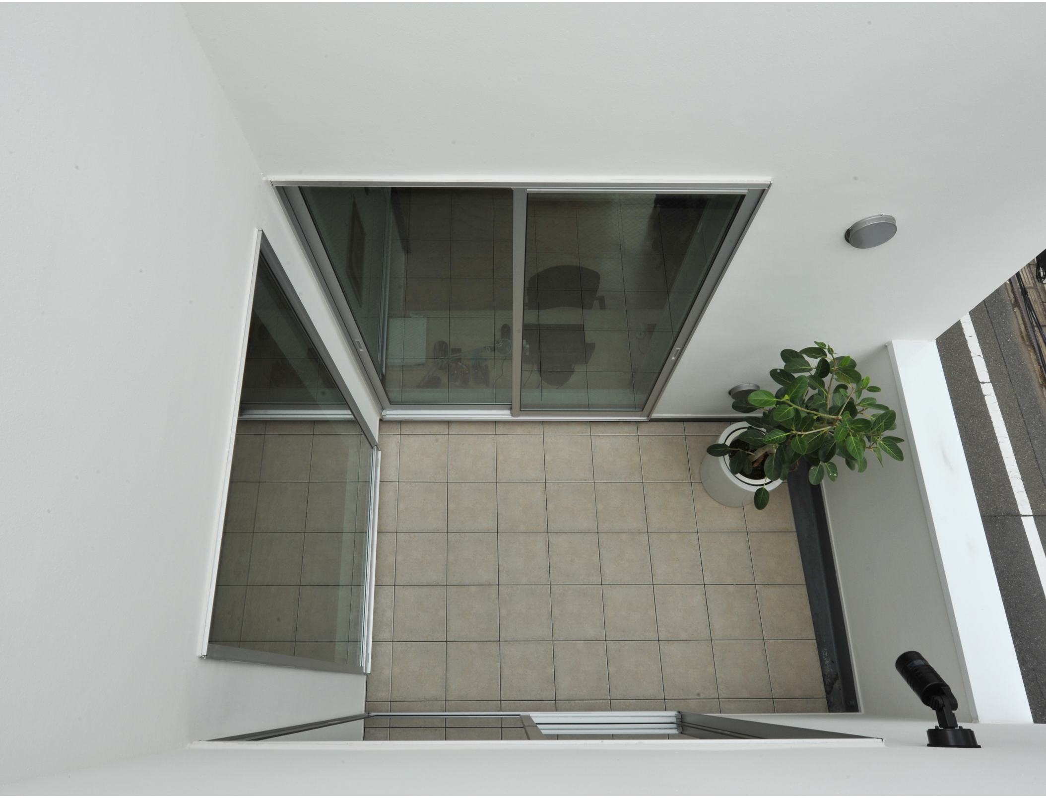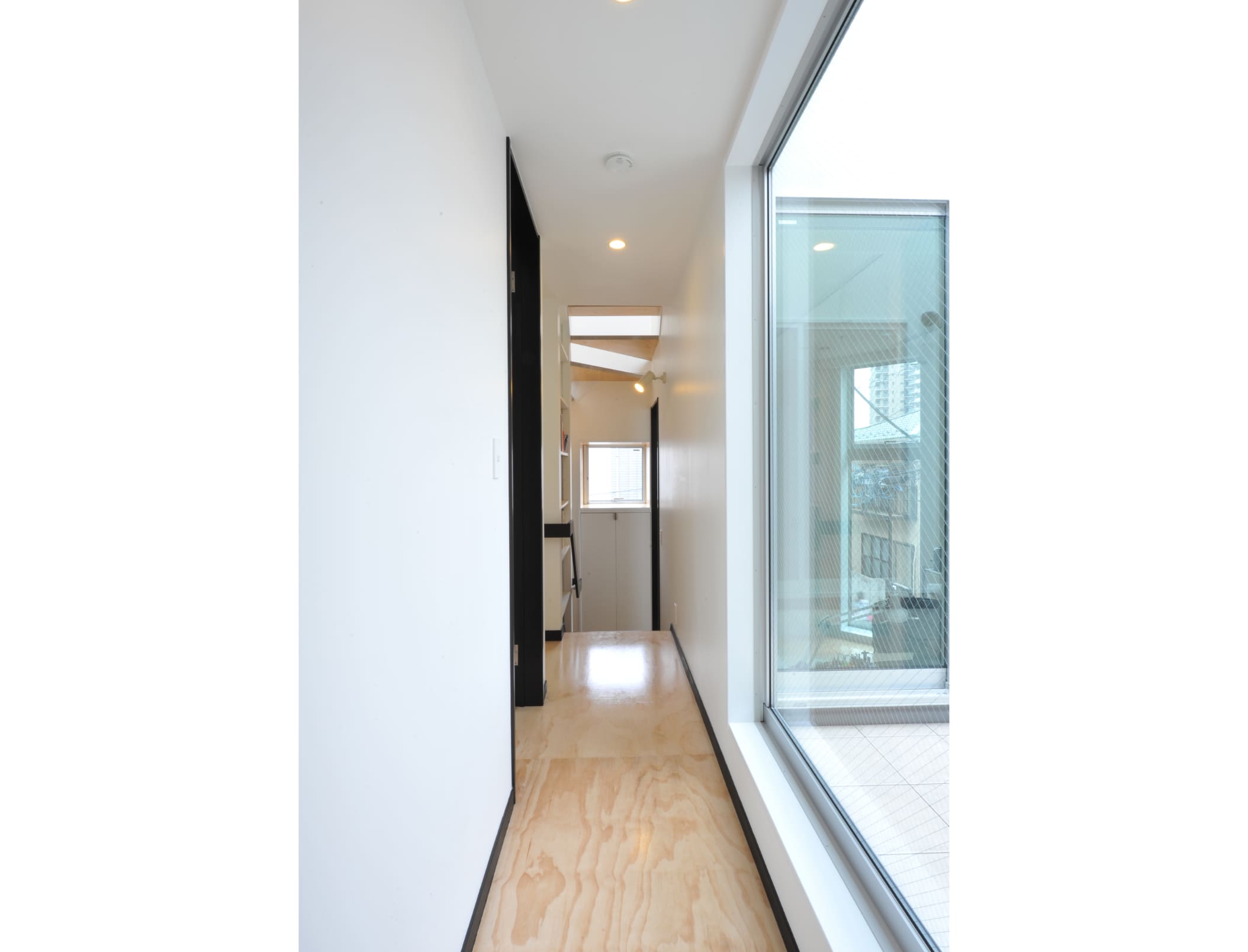 容積率の限度により、居住スペースのボリュームはかなり厳しく制限されてしまったので、2階にルーフバルコニーを計画し、2階の床面積を抑えつつも各部屋との間に「間」を設けることにより、お互いのプライバシーは一定に確保しながらも家族間のコミュニケーションは維持されるようにしました。このバルコニーは各部屋の明り取りとしても機能しています。