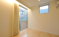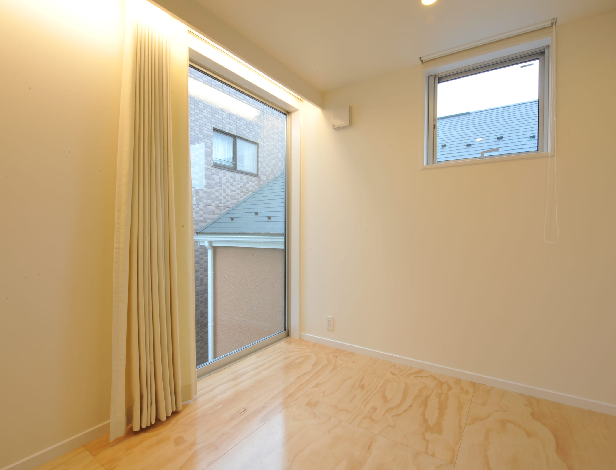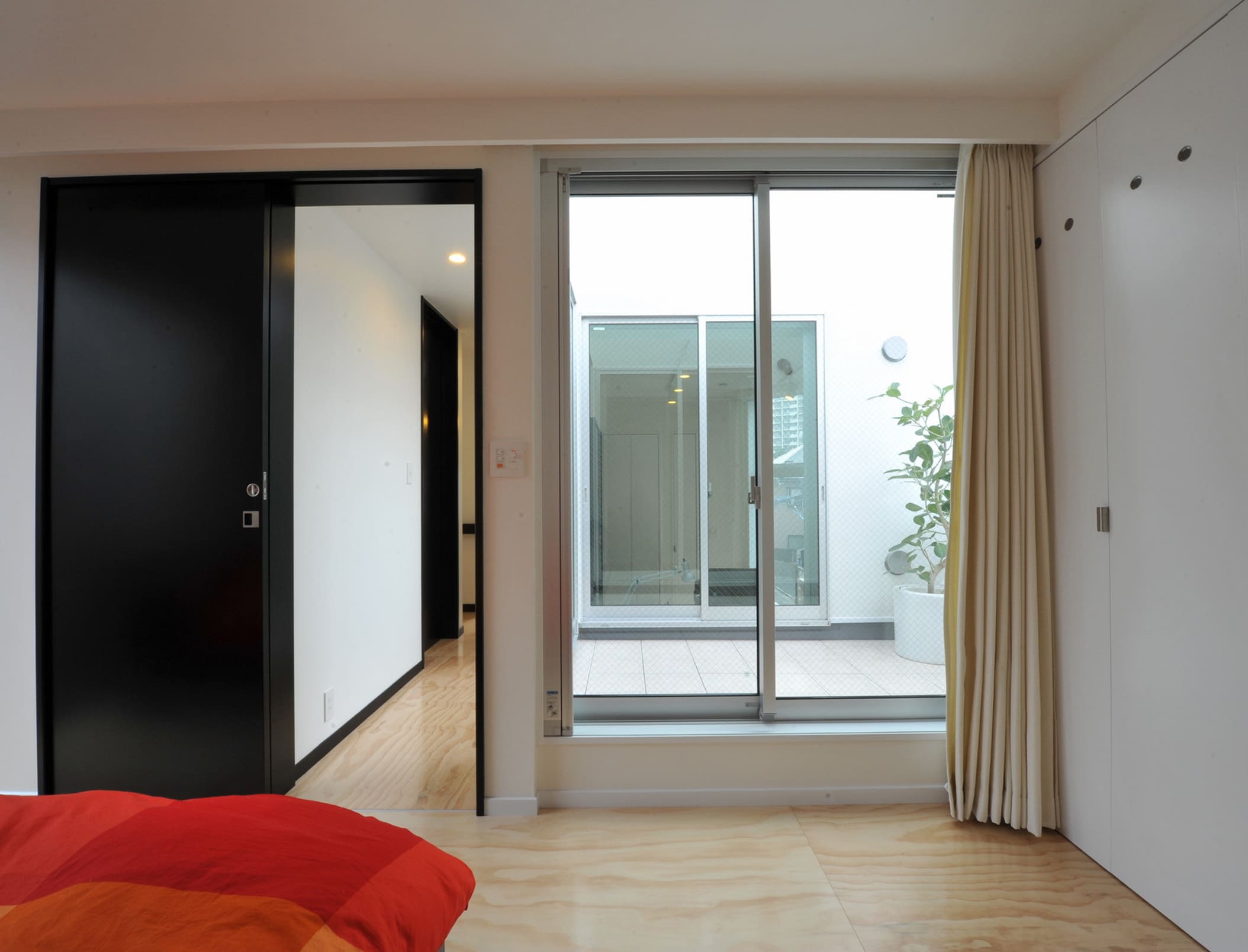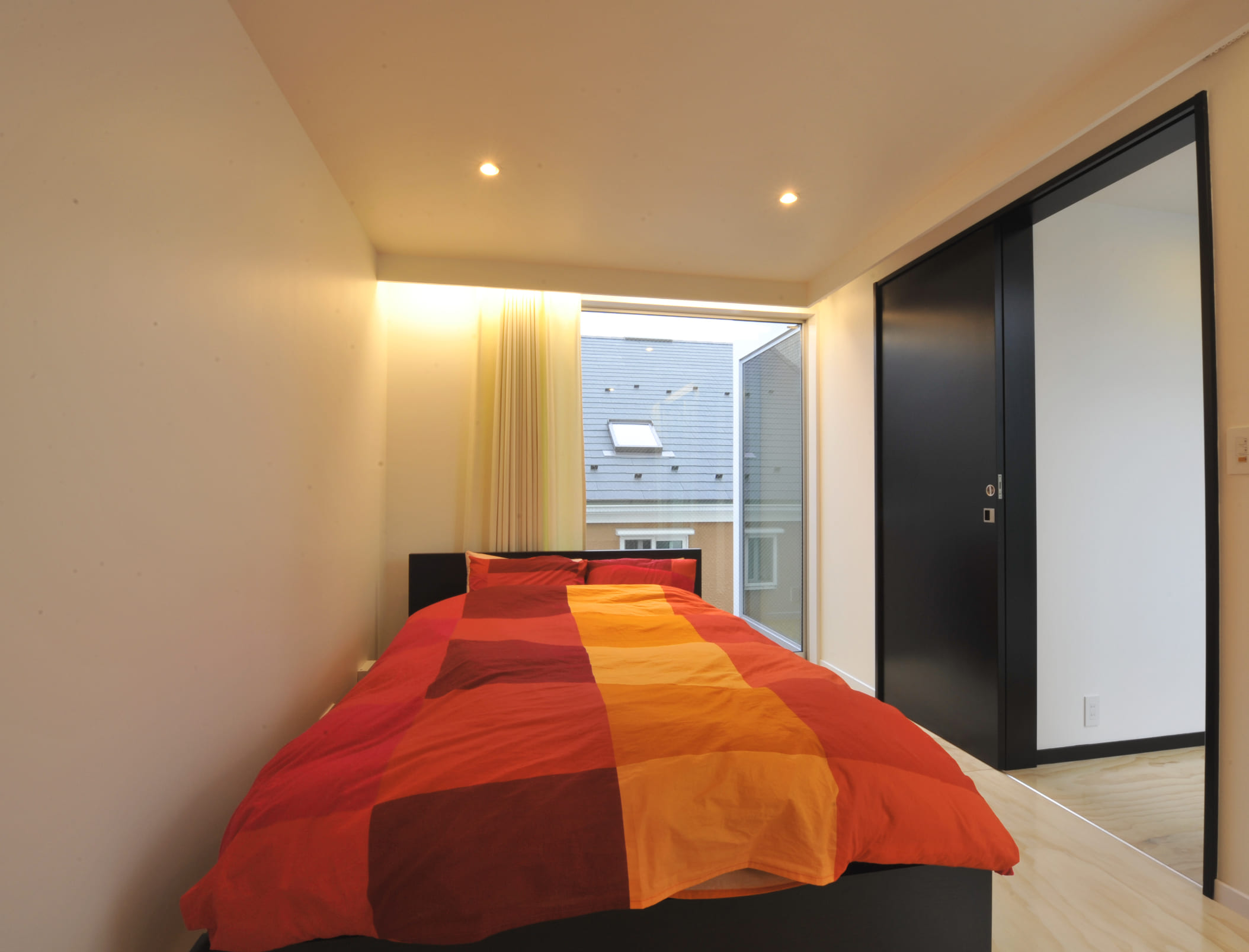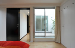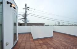 容積率の限度により、居住スペースのボリュームはかなり厳しく制限されてしまったので、2階にルーフバルコニーを計画し、2階の床面積を抑えつつも各部屋との間に「間」を設けることにより、お互いのプライバシーは一定に確保しながらも家族間のコミュニケーションは維持されるようにしました。このバルコニーは各部屋の明り取りとしても機能しています。