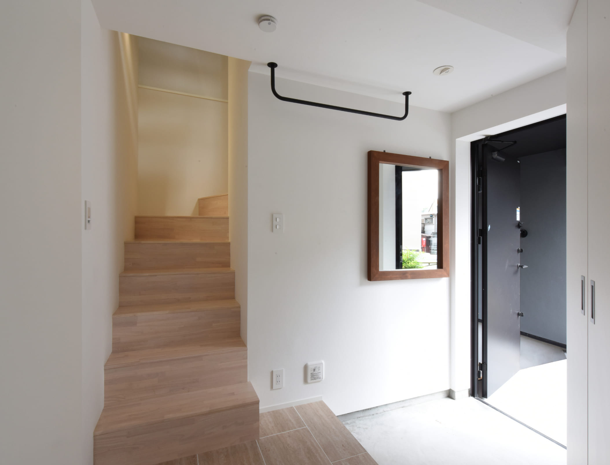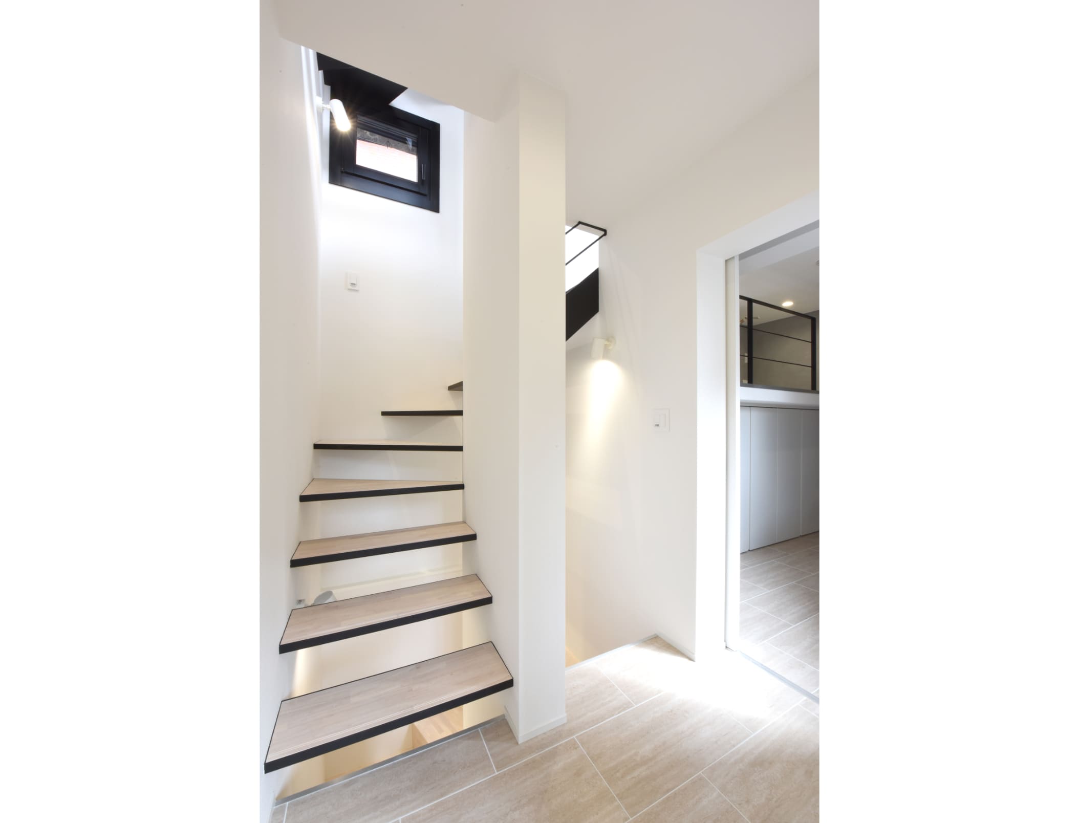 廊下を作ることは出来ないので階段は家の中心とし、開放的な意匠にすることによって、空間の繋がりがスペースとしては最小限としつつも、ゆとりを感じさせるように工夫してあります。