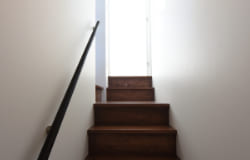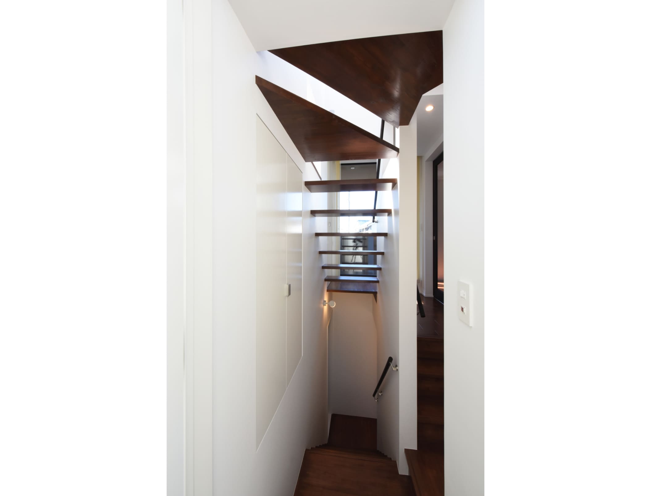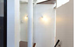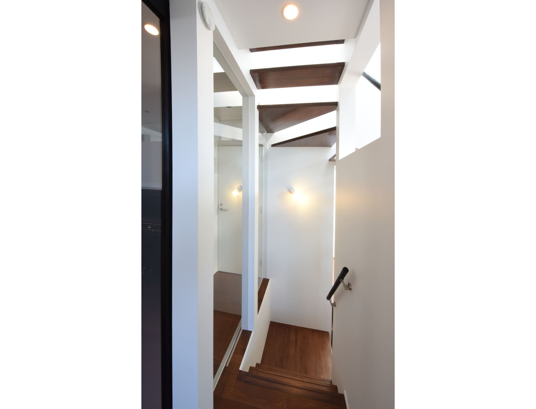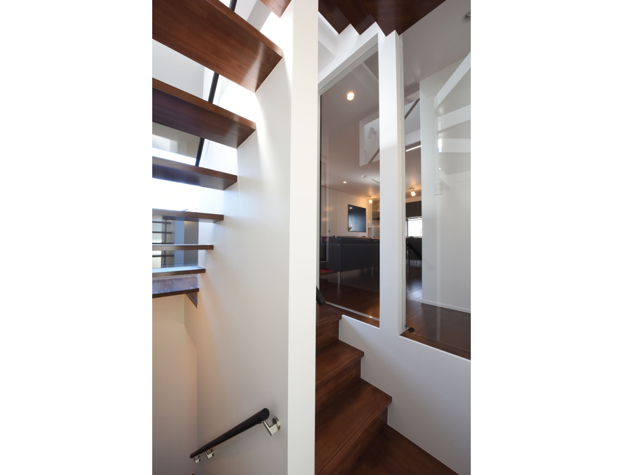 階段室は開口部を設け、出来るだけ光を取り込み、リビングと階段室の間仕切りをガラスにすることにより、階段室の光をリビングに取り込むことが出来るようにしてあります。