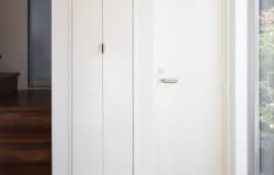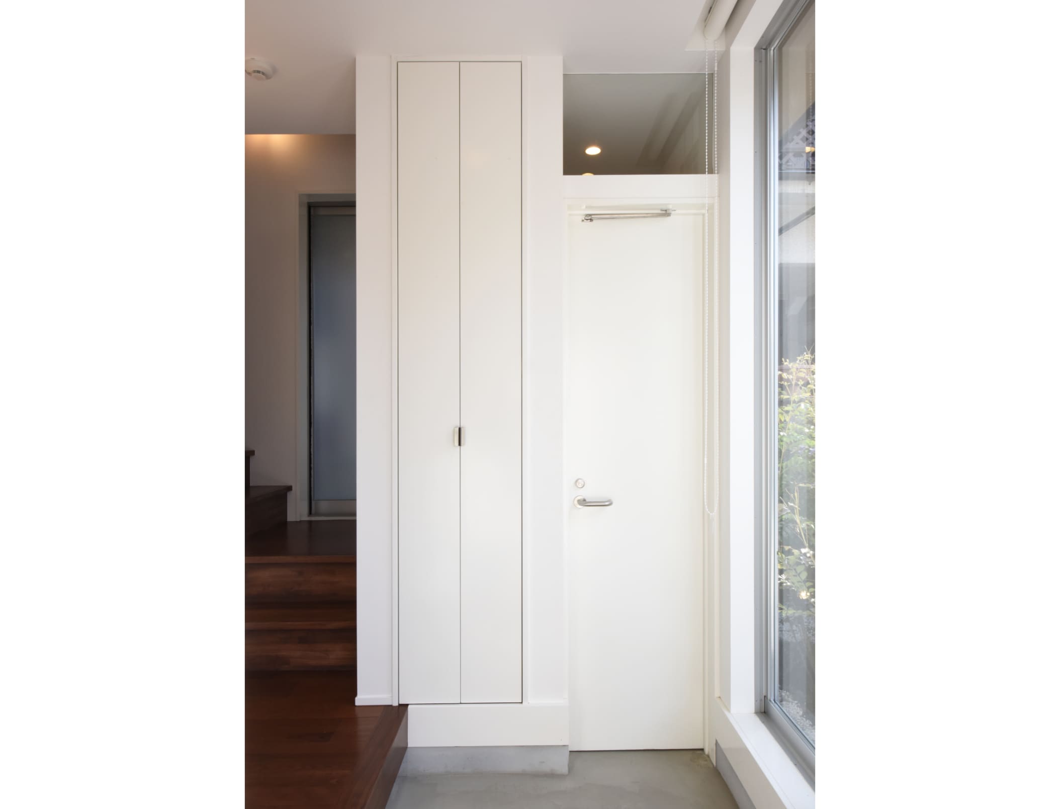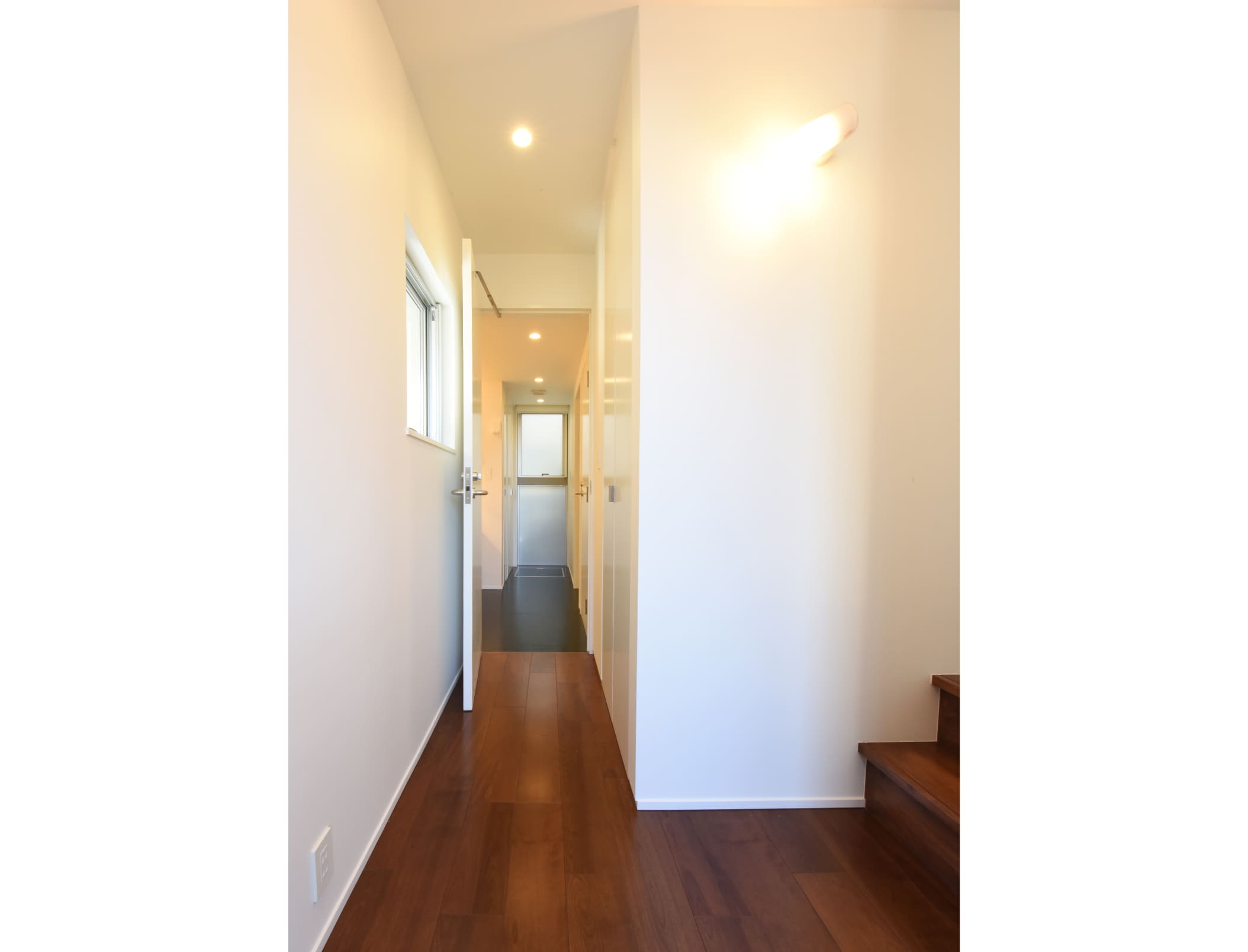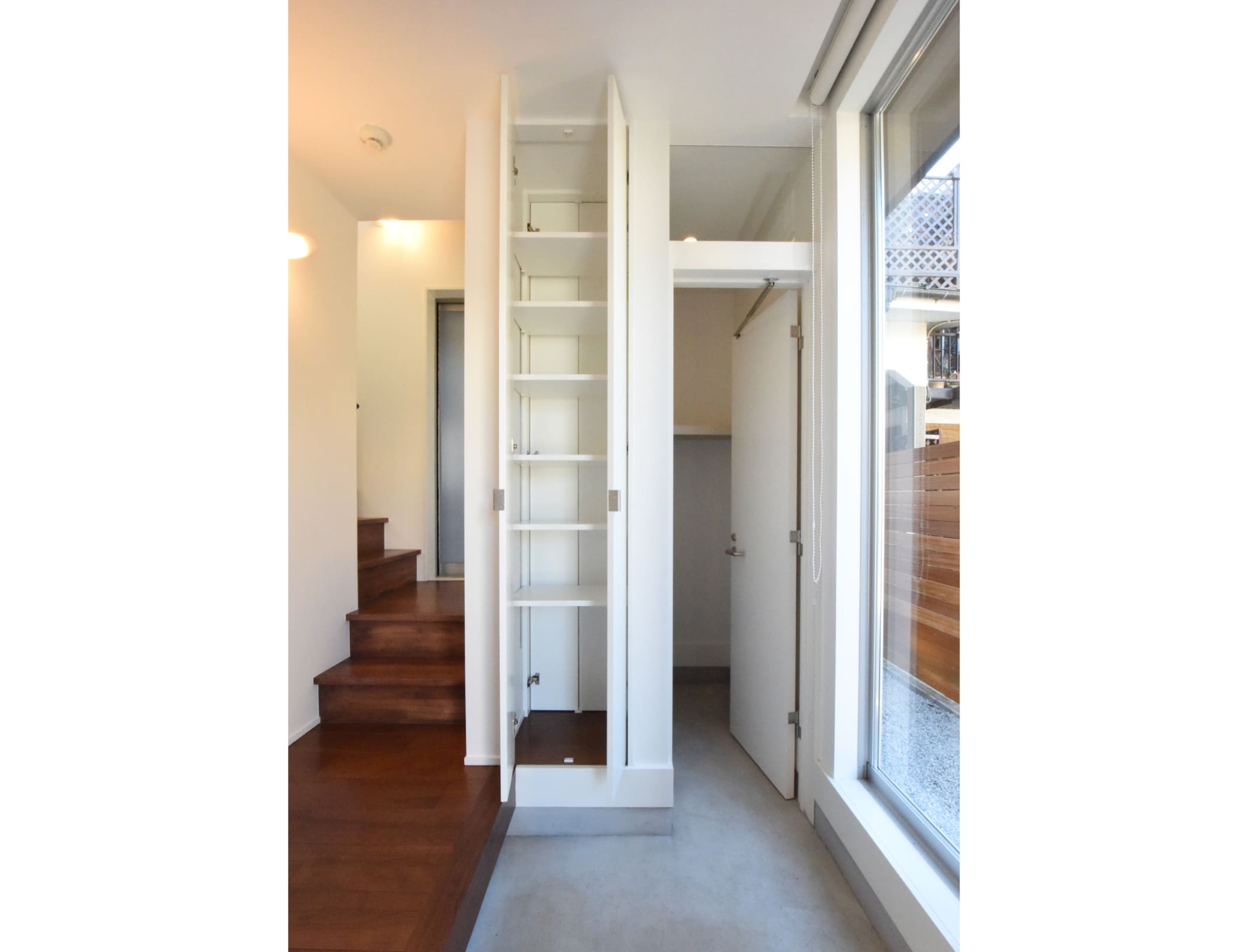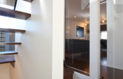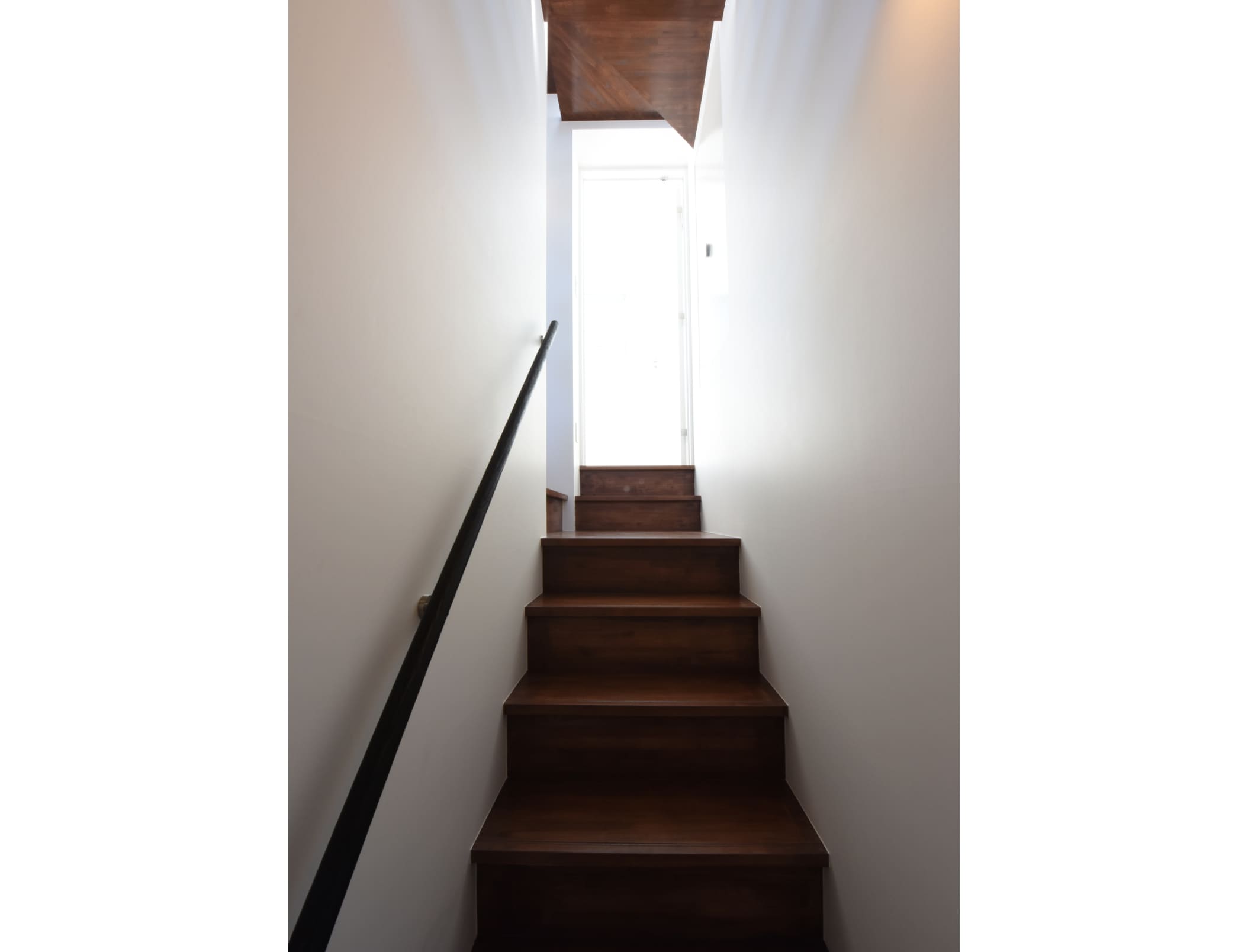 階段室は開口部を設け、出来るだけ光を取り込み、リビングと階段室の間仕切りをガラスにすることにより、階段室の光をリビングに取り込むことが出来るようにしてあります。
