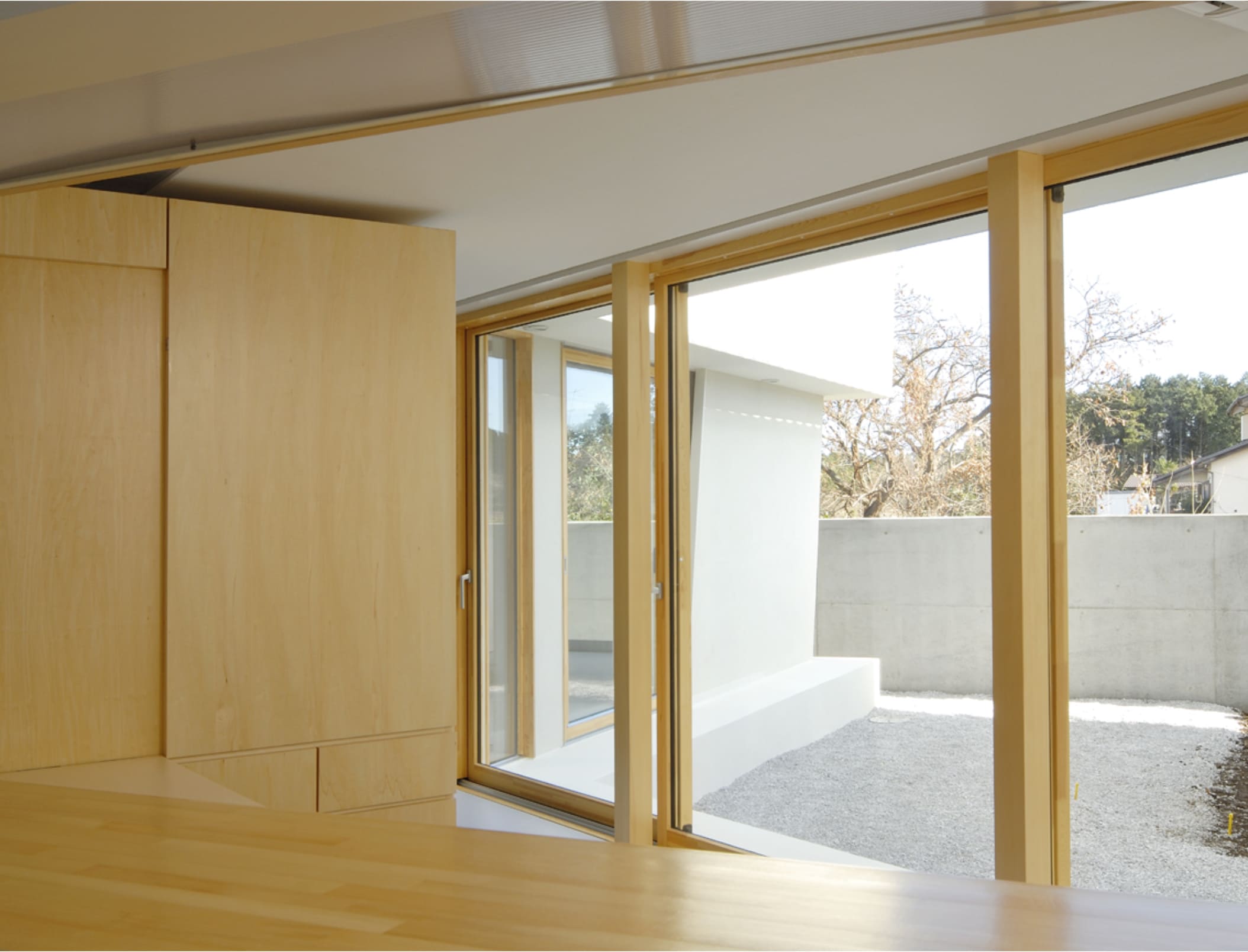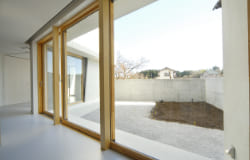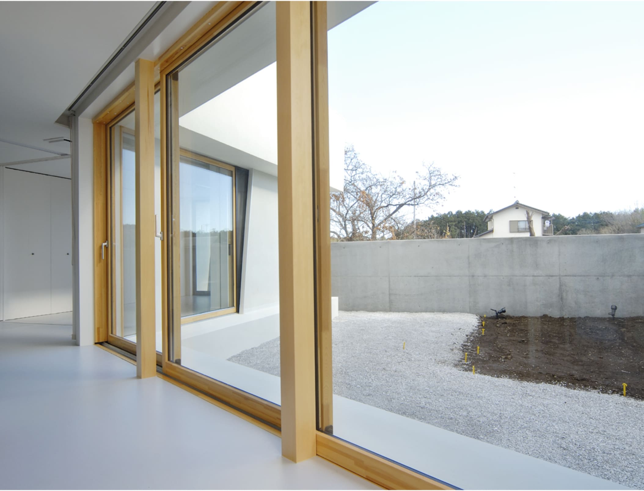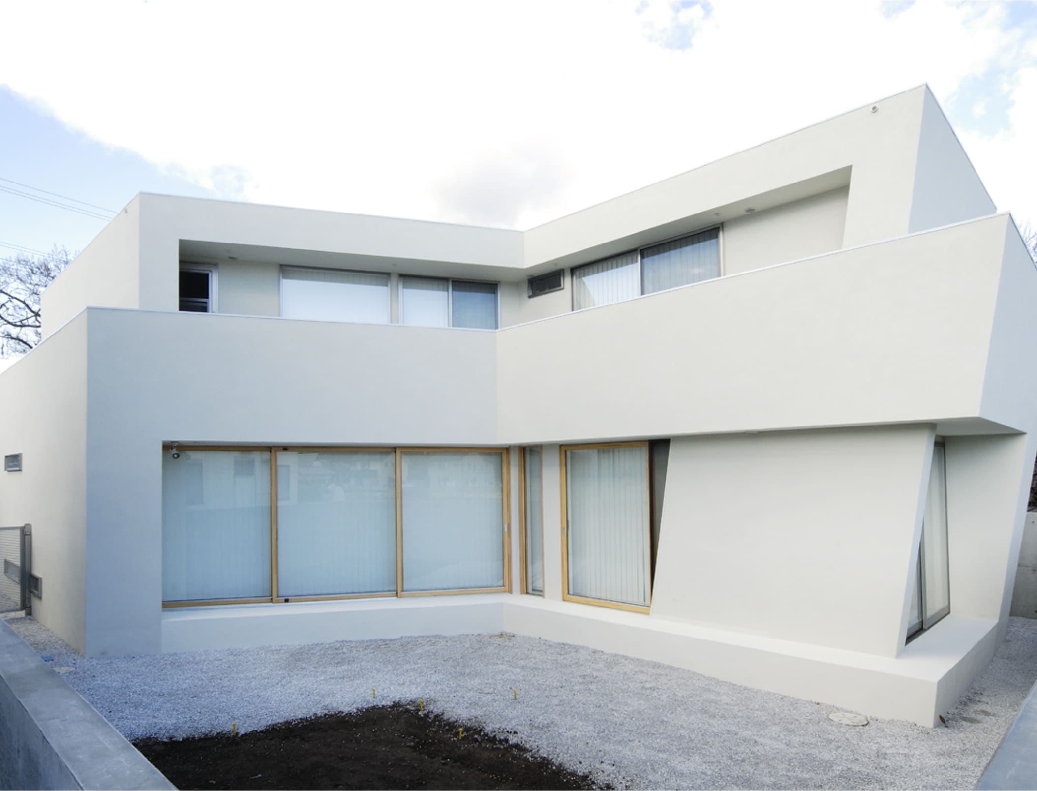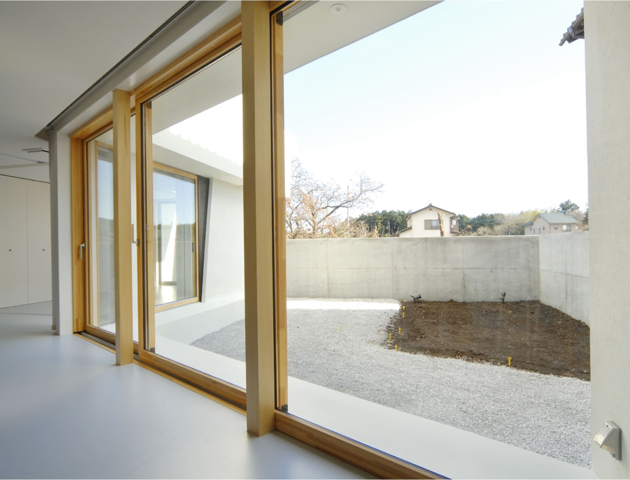 敷地境界をなぞる塀は、庭空間を包み込むように配置されていて、その端部は建物の第三のボリュームとなっています。
