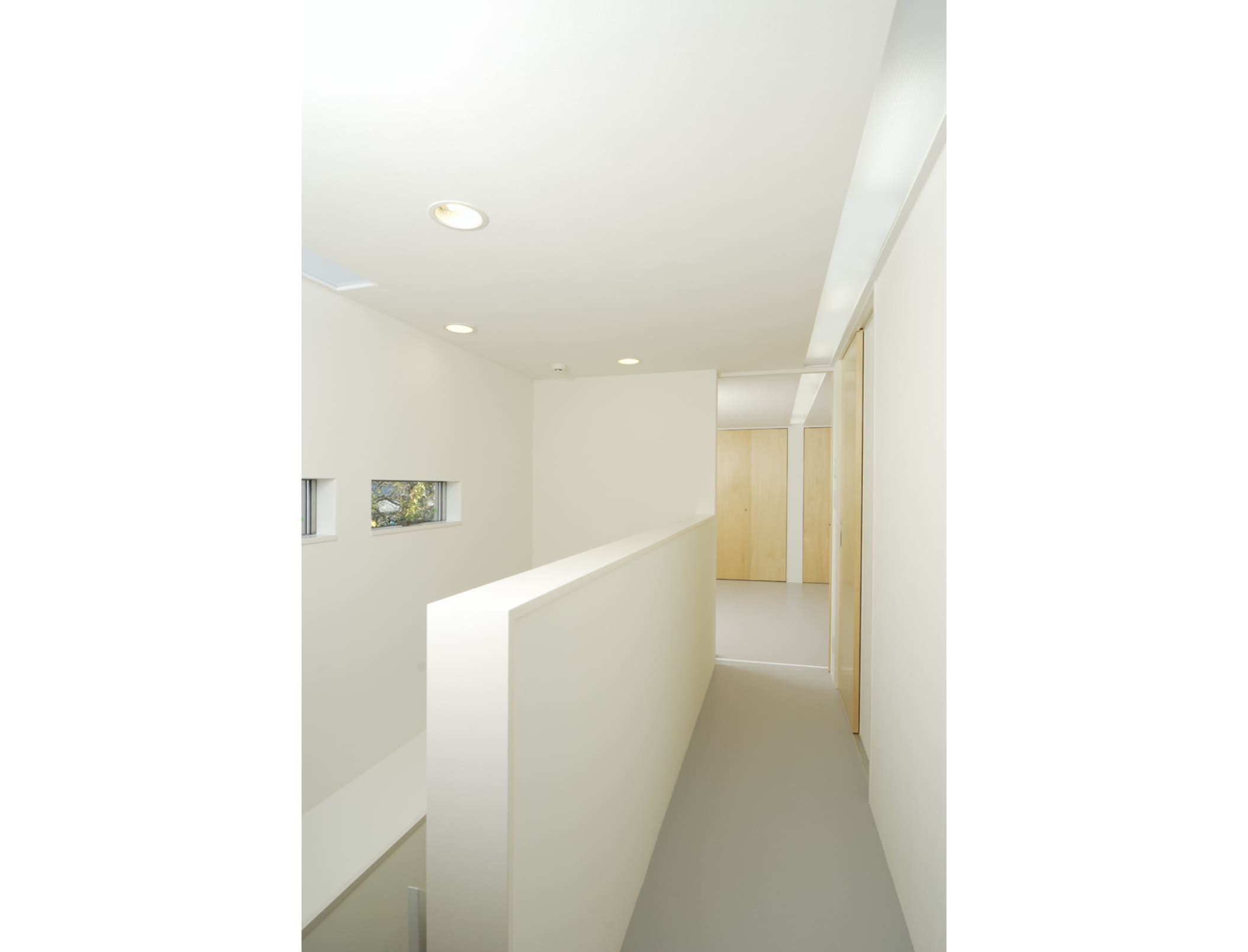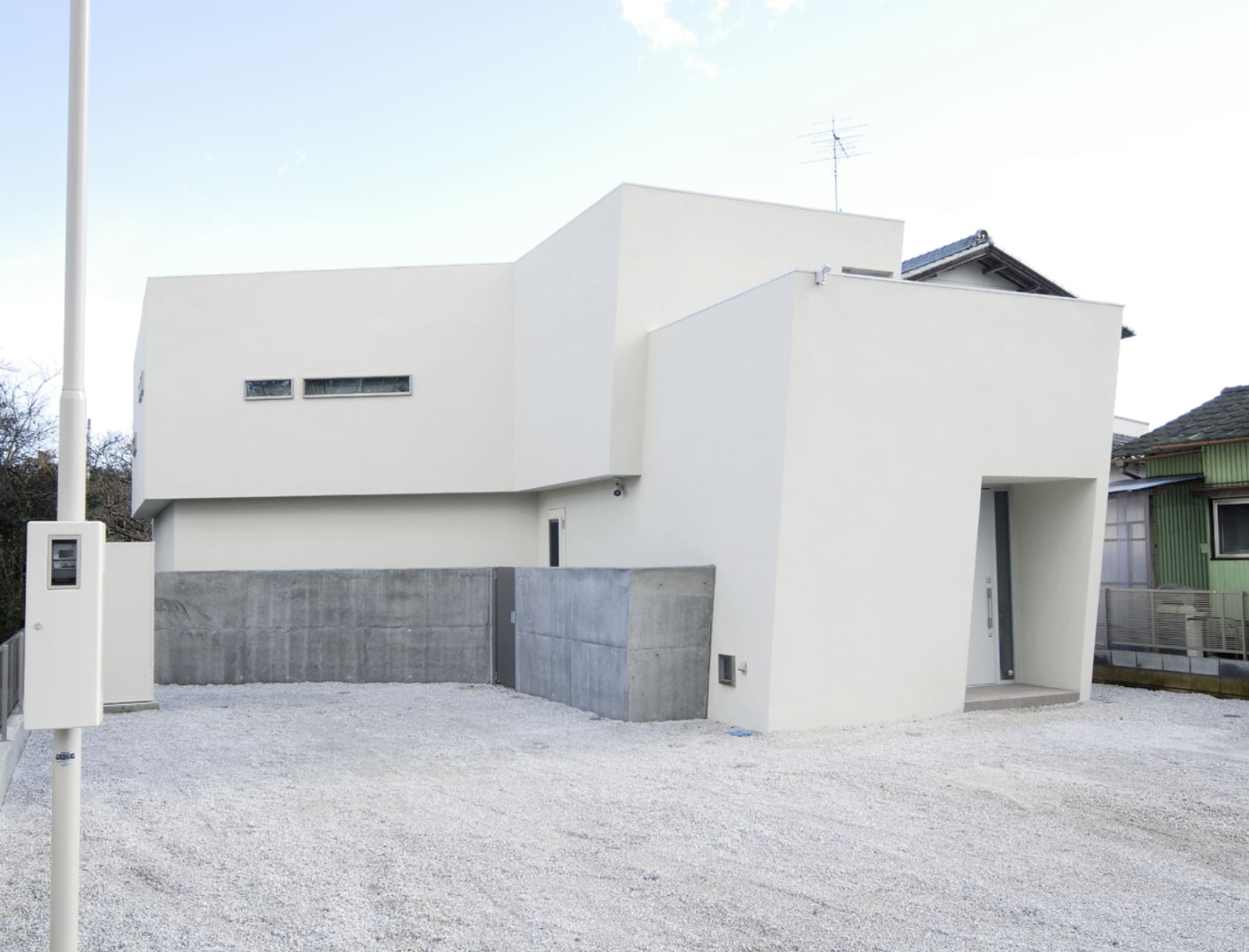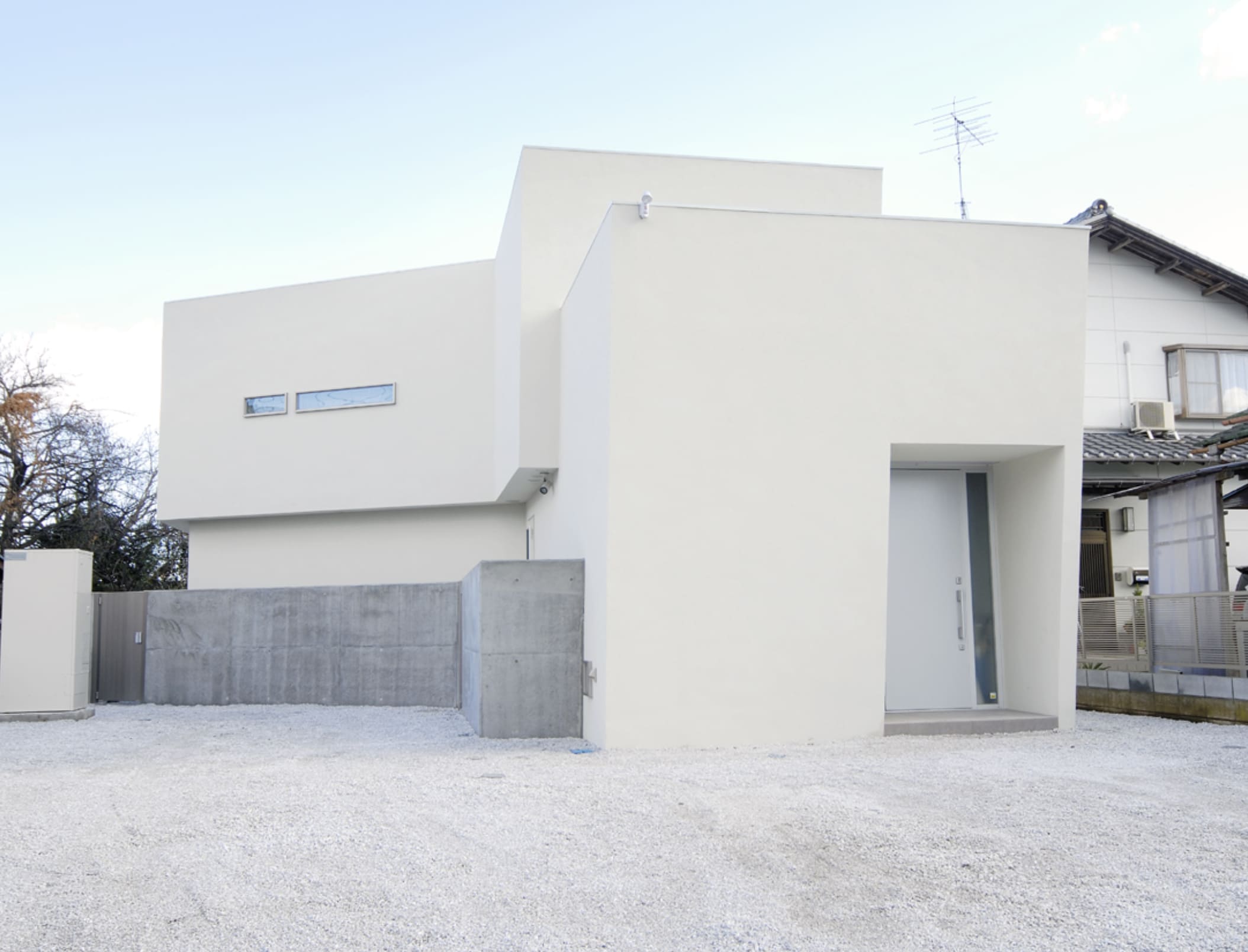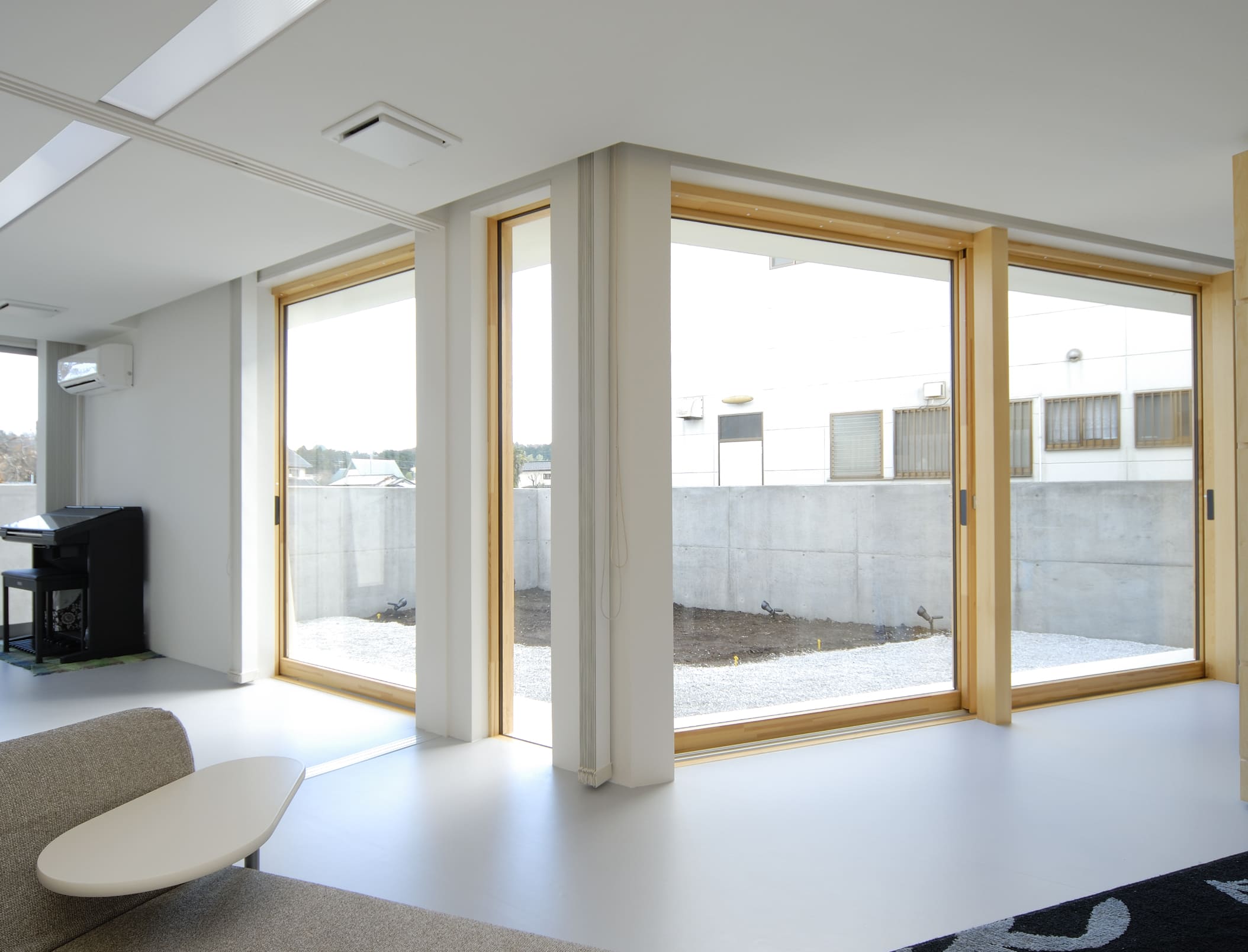 敷地境界をなぞる塀は、庭空間を包み込むように配置されていて、その端部は建物の第三のボリュームとなっています。
