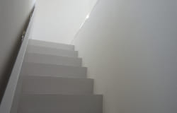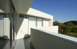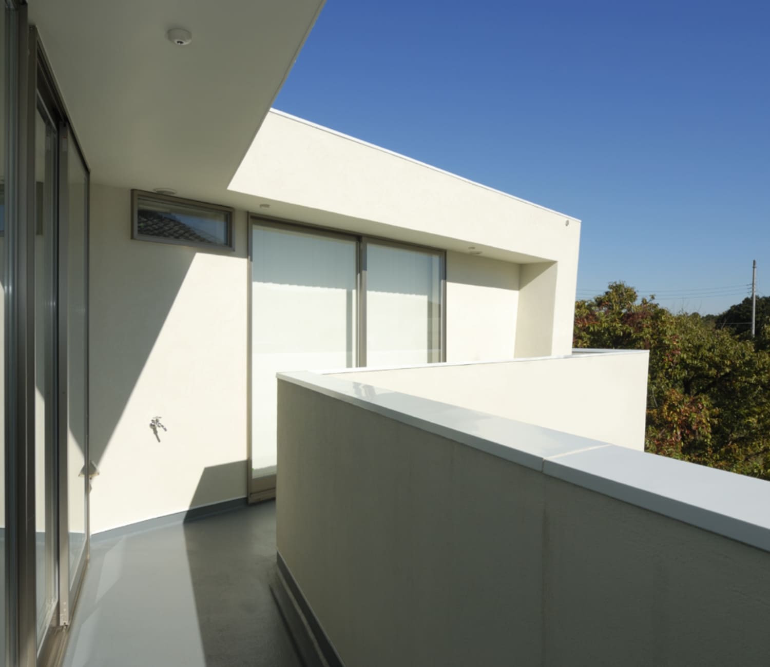 バルコニースペースを形成するため、1階と2階のボリュームはシフトされ、南側に出来たスペースをバルコニーとし、まとまった広いバルコニーもほしいということから、玄関部分の上に6畳程の広いバルコニーを計画しました。