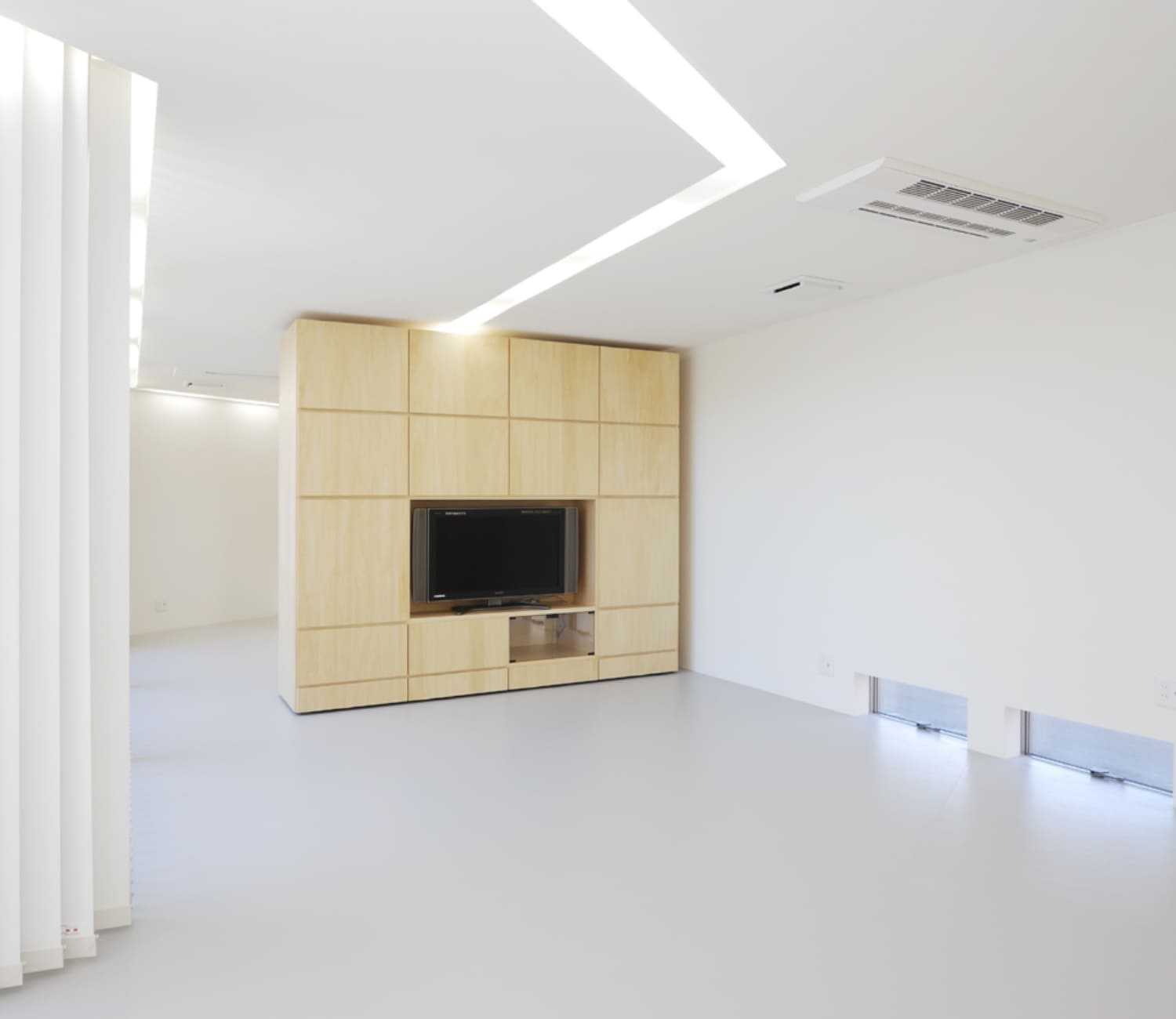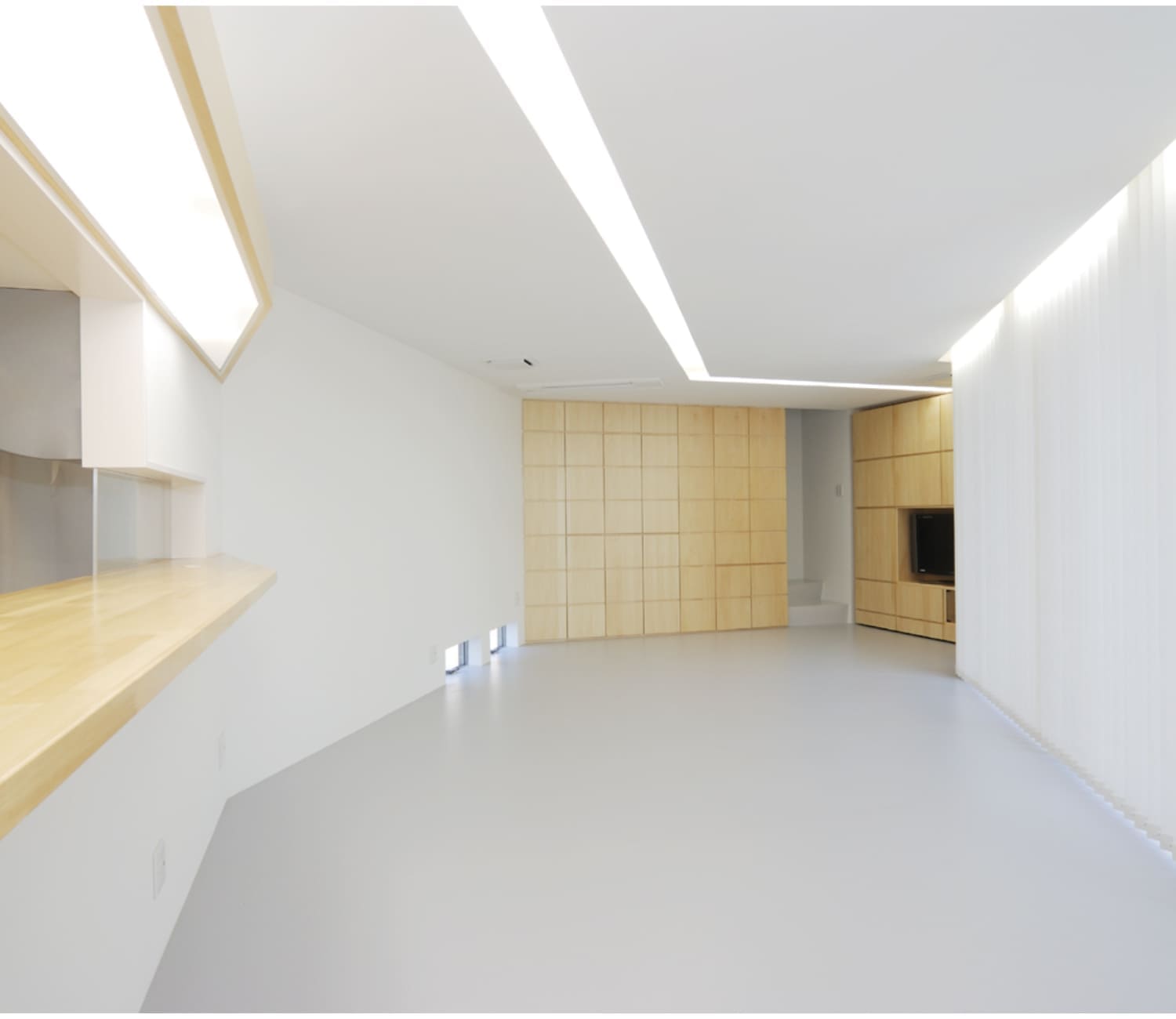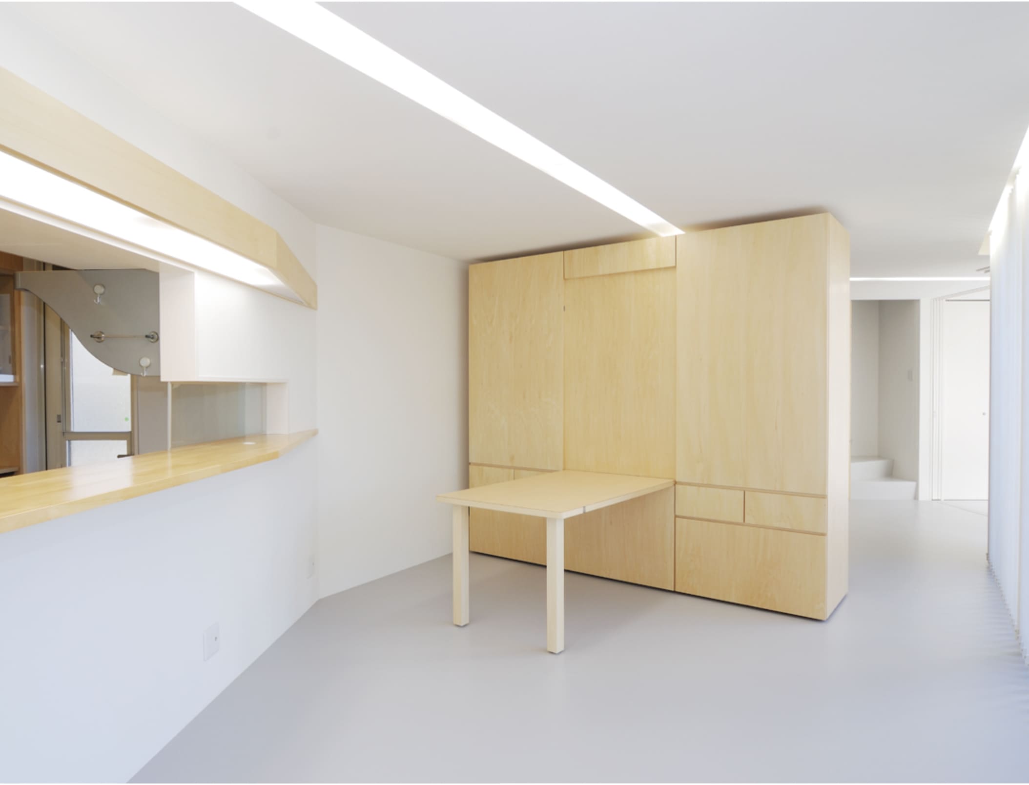 この壁がダイニングテーブルになったり、キャビネットになったり、TV台としても機能するようにデザインされています。